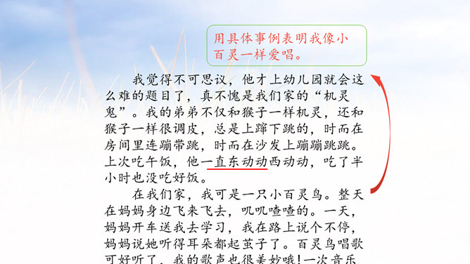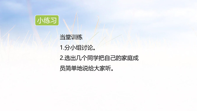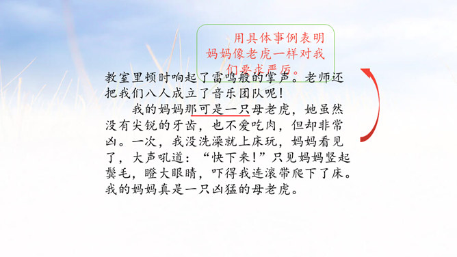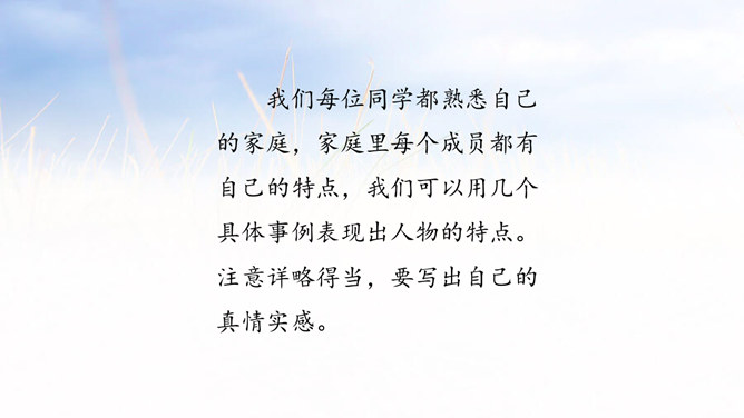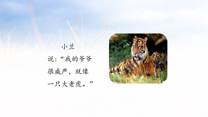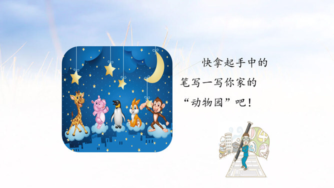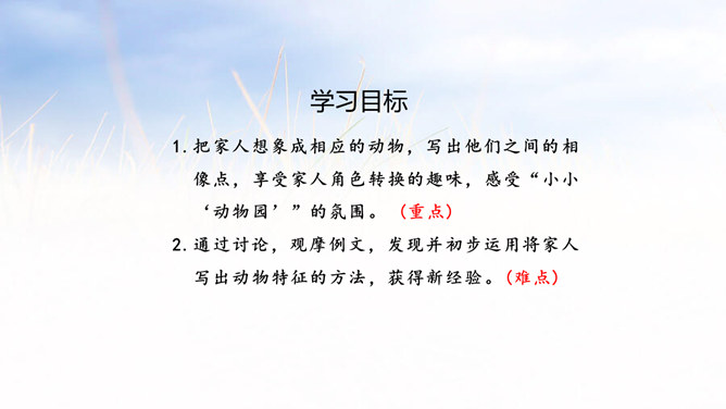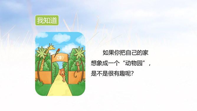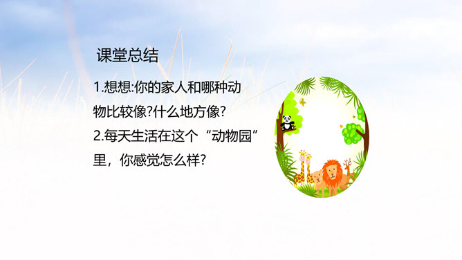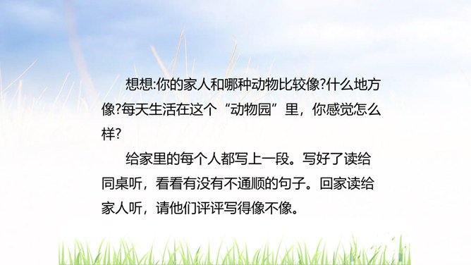想想:你的家人和哪种动物比较像?什么地方像?每天生活在这个“动物园”里,你感觉怎么样?给家里的每个人都写上一段。写好了读给同桌听,看看有没有不通顺的句子。回家读给家人听,请他们评评写得像不像。1.把家人想象成相应的动物,写出他们之间的相像点,享受家人角色转换的趣味,感受“小小‘动物园’”的氛围。 (重点)2.通过讨论,观摩例文,发现并初步运用将家人写出动物特征的方法,获得新经验。(难点)所属专题:小小动物园ppt。