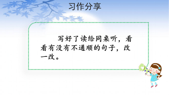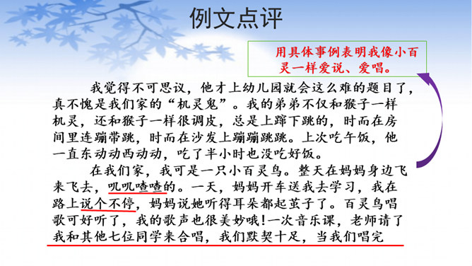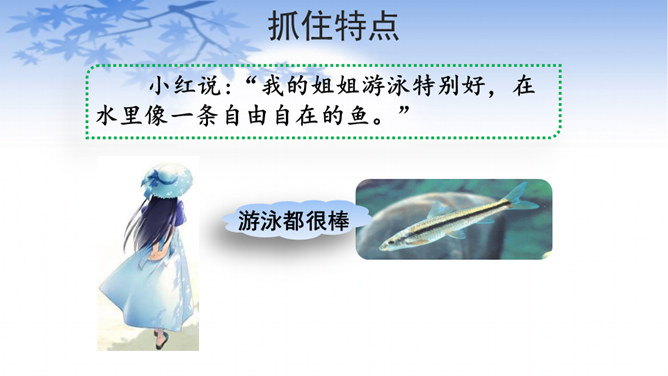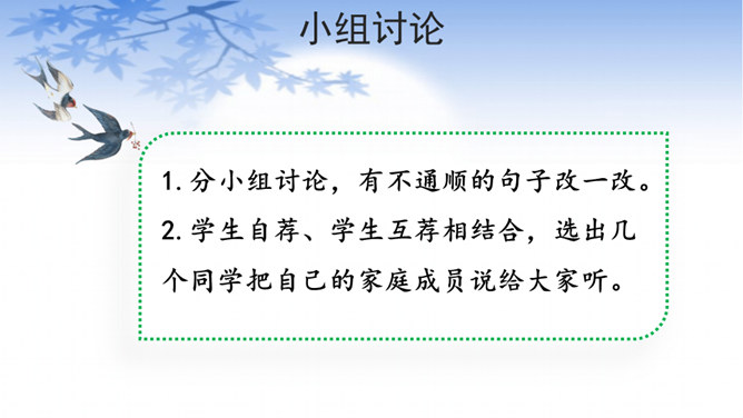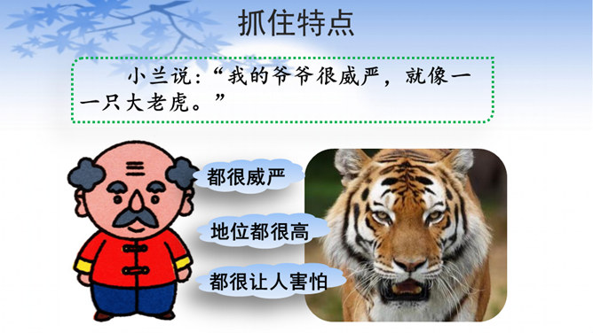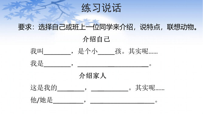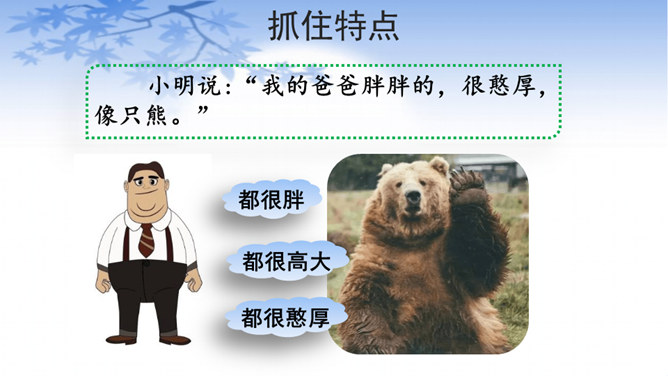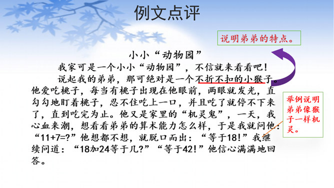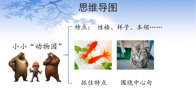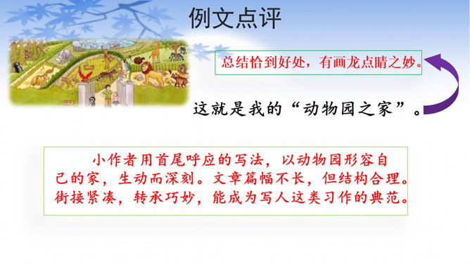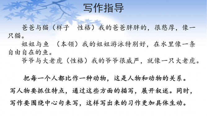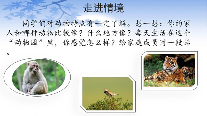把每一个人都比作一种动物,这是人物和动物的关系。写人物要抓住特点,通过这些方面的描写,展开叙述。同时,写作要围绕中心句来写,这样写出来的习作更加具体生动。1.分小组讨论,有不通顺的句子改一改。2.学生自荐、学生互荐相结合,选出几个同学把自己的家庭成员说给大家听。小作者用首尾呼应的写法,以动物园形容自己的家,生动而深刻。文章篇幅不长,但结构合理。街接紧凑,转承巧妙,能成为写人这类习作的典范。所属专题:小小动物园ppt。
