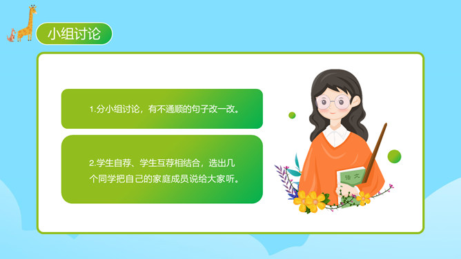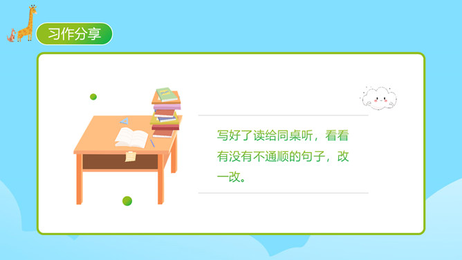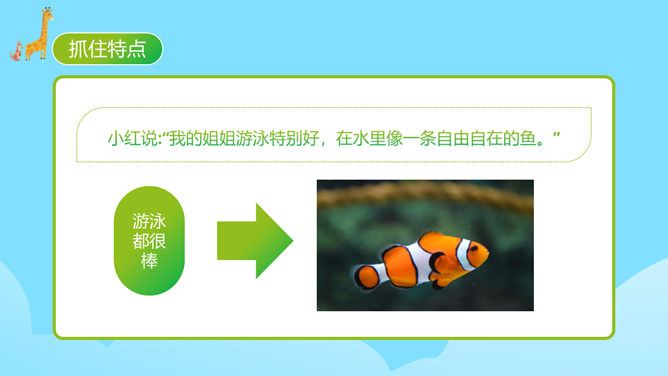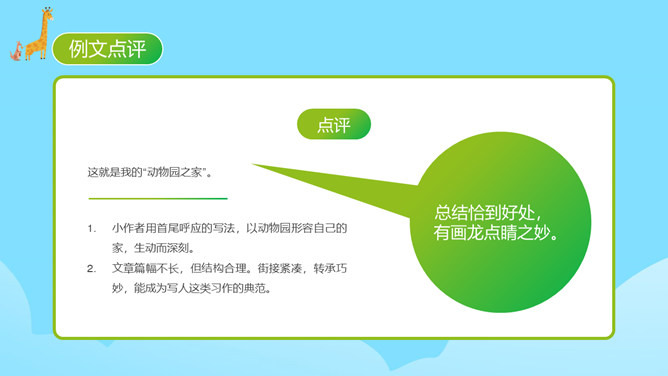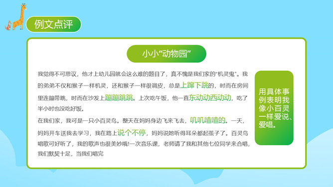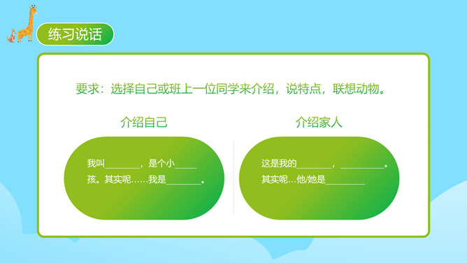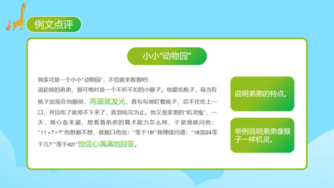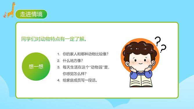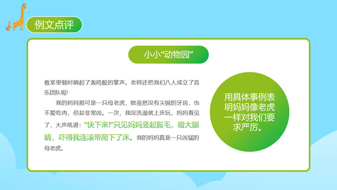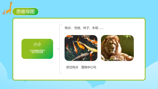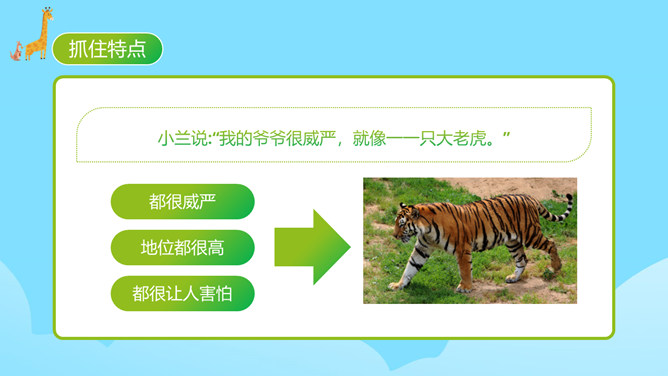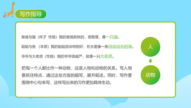 每个人都有自己喜欢的动物,大家来猜猜是什么动物。同学们对动物特点有一定了解。你的家人和哪种动物比较像?什么地方像?每天生活在这个“动物园”里,你感觉怎么样?给家庭成员写一段话。 把每一个人都比作一种动物,这是人物和动物的关系。写人物要抓住特点,通过这些方面的描写,展开叙述。同时,写作要围绕中心句来写,这样写出来的习作更加具体生动。爷爷与大老虎(性格)我的爷爷很威严,就像一只大老虎。所属专题:小小动物园ppt。