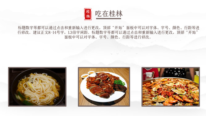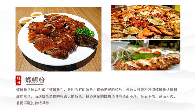 桂林旅游攻略景点PPT模板。一套桂林旅游旅行攻略幻灯片模板,包括必去景点、美食、游玩项目介绍等内容。