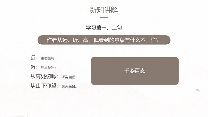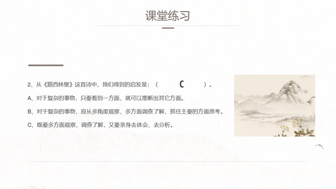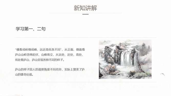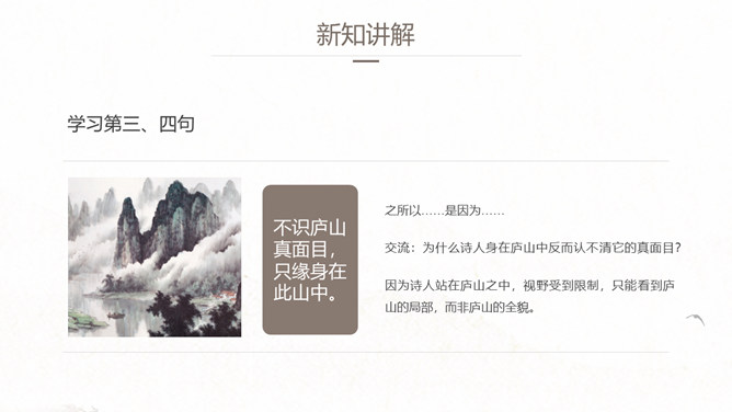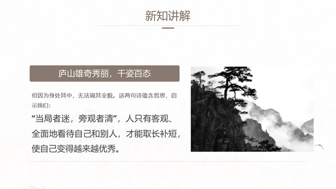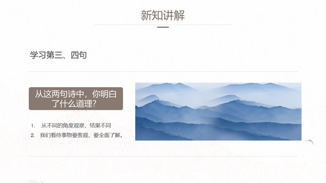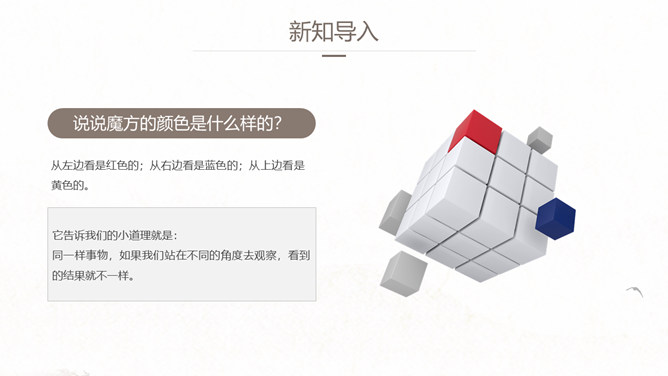 说说魔方的颜色是什么样的?从左边看是红色的;从右边看是蓝色的;从上边看是黄色的。它告诉我们的小道理就是:同一样事物,如果我们站在不同的角度去观察,看到的结果就不一样。要求:不认识的字可以看拼音,或者请教老师和同学。读准每一个字的字音,圈出生字词;读通每个句子,读不通顺的多读几遍;通读古诗,给诗文划分小节,注意句子的停顿。庐山的样子因人的观察角度不同而异,实际上赞美了庐山的雄奇壮观。所属专题:题西林壁ppt。