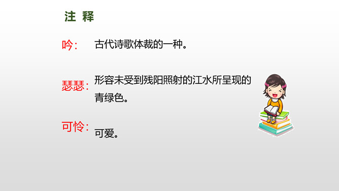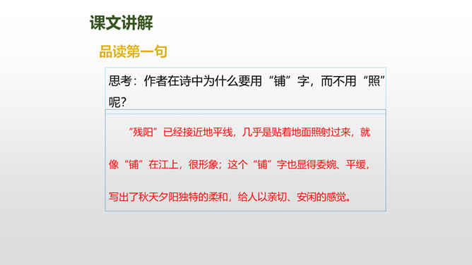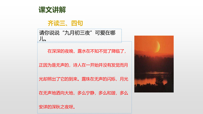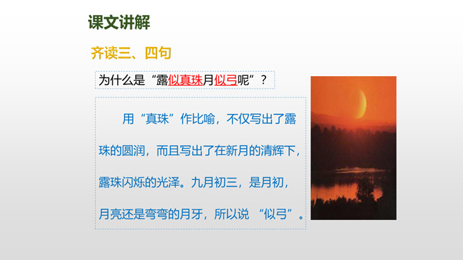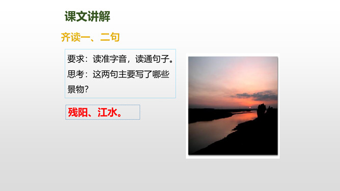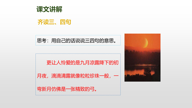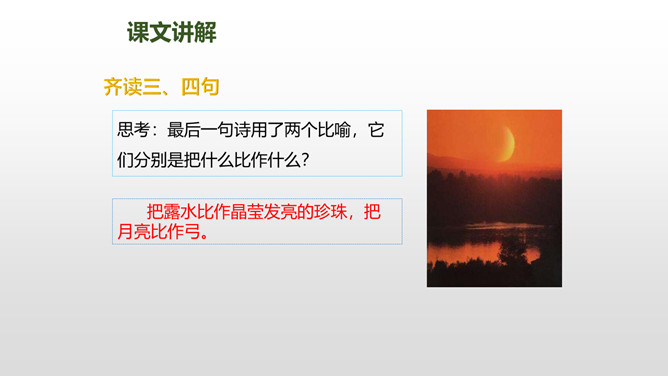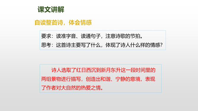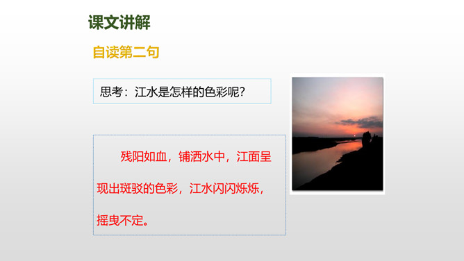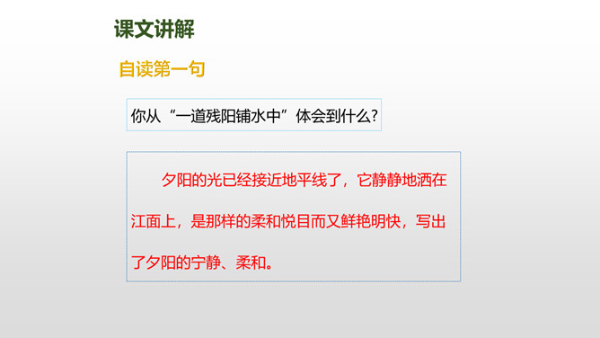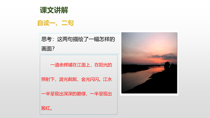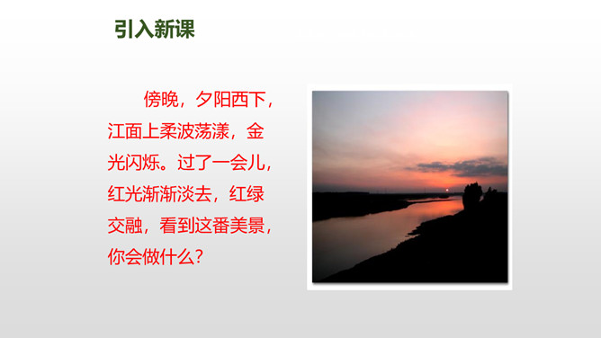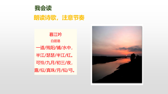 傍晚,夕阳西下,江面上柔波荡漾,金光闪烁。过了一会儿,红光渐渐淡去,红绿交融,看到这番美景,你会做什么?要求:读准字音、读通句子,注意诗歌的节拍。思考:这首诗主要写了什么,体现了诗人什么样的情感?诗人选取了红日西沉到新月东升这一段时间里的两组景物进行描写,创造出和谐、宁静的意境,表现了作者对大自然的热爱之情。思考:这两句描绘了一幅怎样的画面?所属专题:暮江吟ppt。