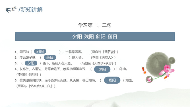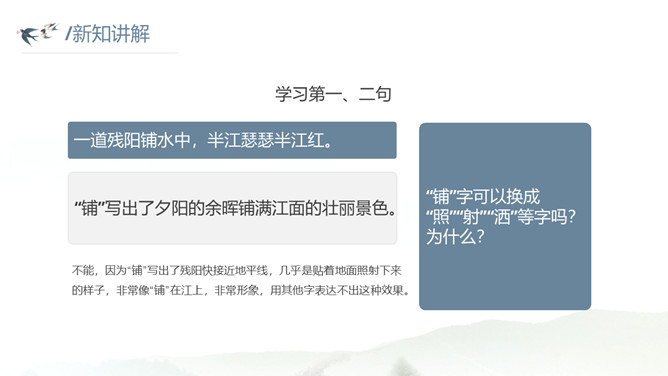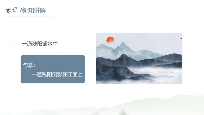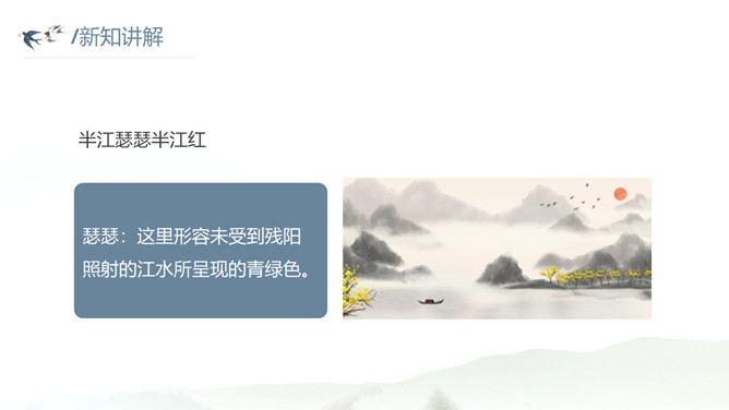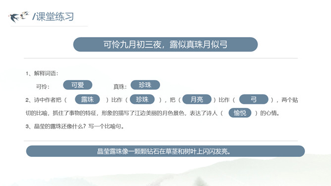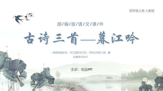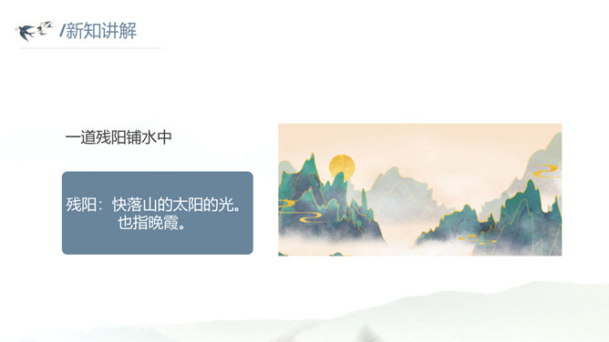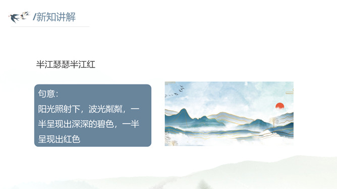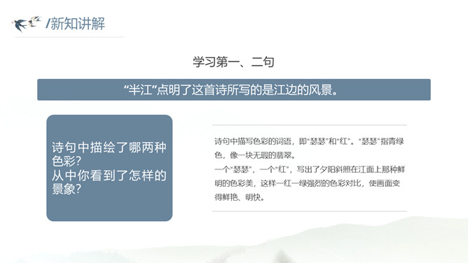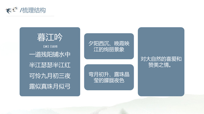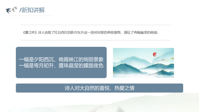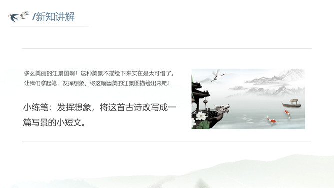 这种美景不描绘下来实在是太可惜了。让我们拿起笔,发挥想象,将这幅幽美的江景图描绘出来吧!小练笔:发挥想象,将这首古诗改写成一篇写景的小短文。大自然中的两幅优美的画面组合在一起,一幅绚烂,一幅清雅,表达了作者远离朝廷之后轻松愉悦的心情,同时也蕴含着他对大自然的喜爱和赞美之情。请把自己当作诗人身临其境,想一想身在画境中的自己会有什么样的心情和感受?把想到的写出来和小组内同学展开讨论。所属专题:暮江吟ppt。