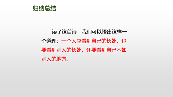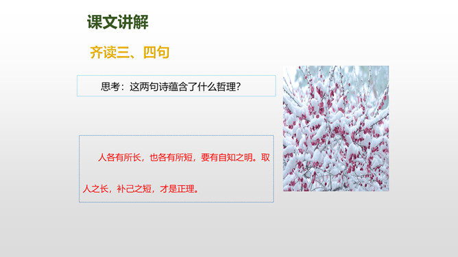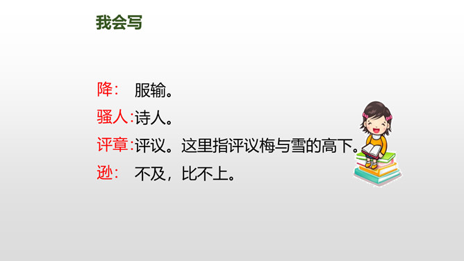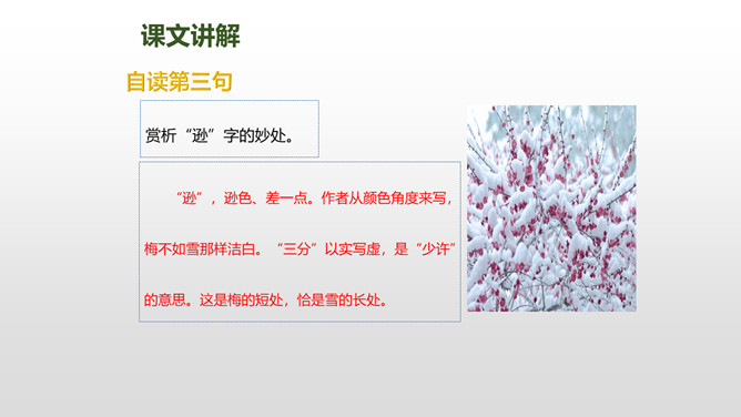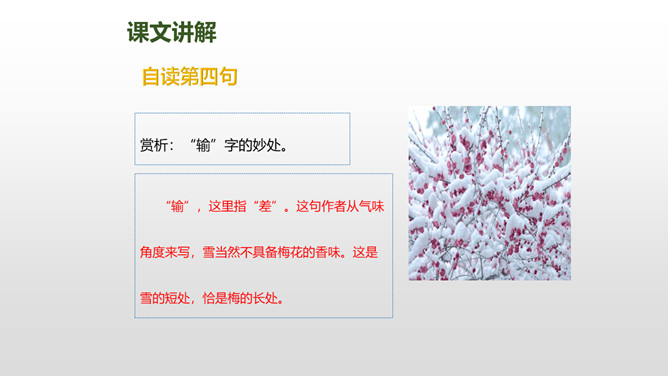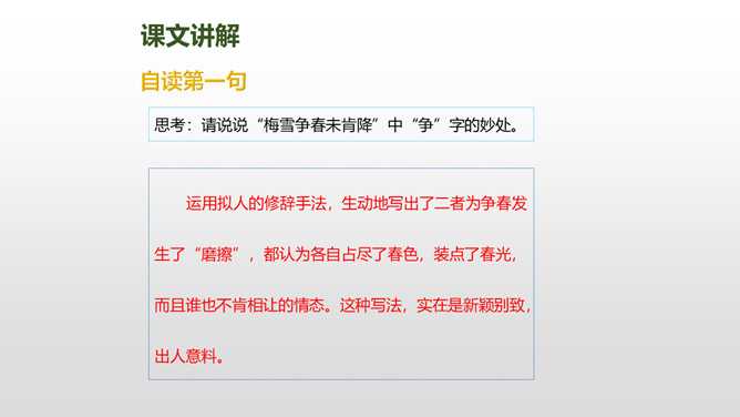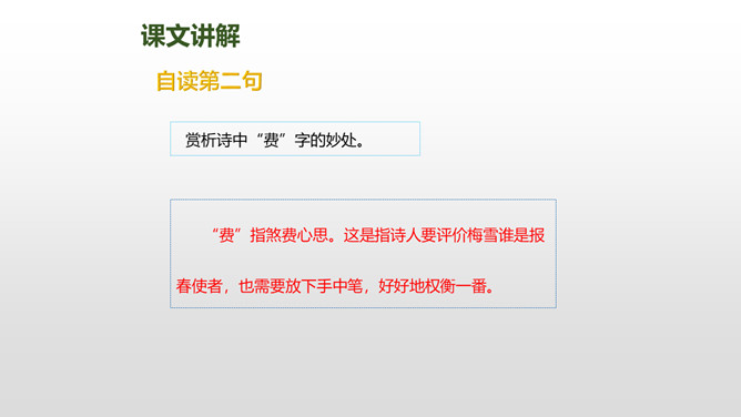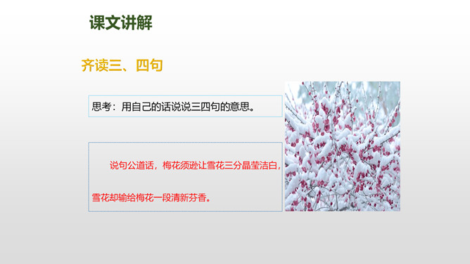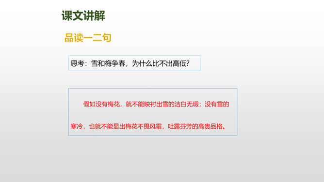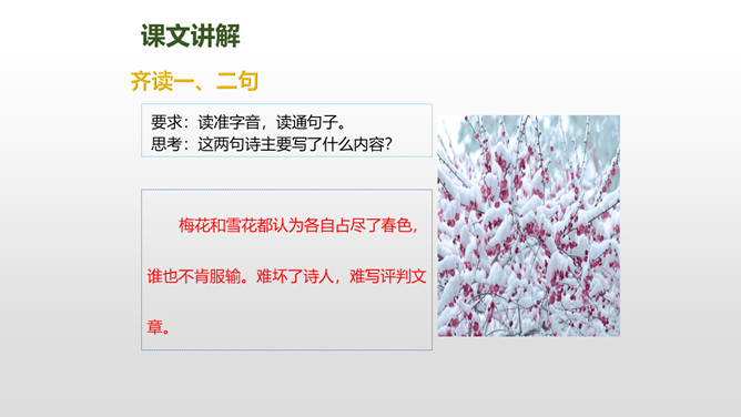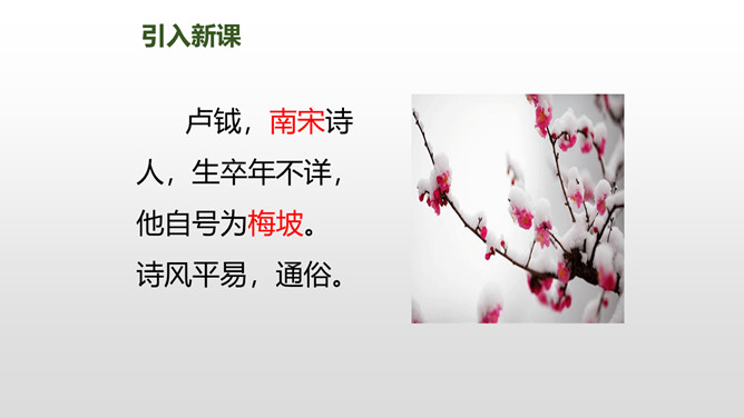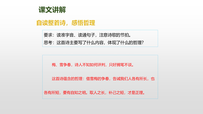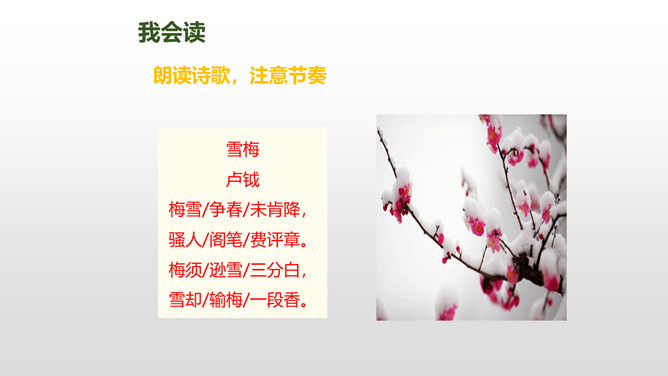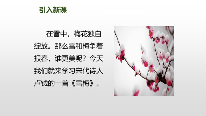 那么雪和梅争着报春,谁更美呢?今天我们就来学习宋代诗人卢钺的一首《雪梅》。要求:读准字音、读通句子,注意诗歌的节拍。思考:这首诗主要写了什么内容,体现了什么的哲理?梅、雪争春,诗人不知如何评判,只好搁笔不谈。这首诗蕴含的哲理:借雪梅的争春,告诫我们人各有所长,也各有所短,要有自知之明。取人之长,补己之短,才是正理。梅花和雪花都认为各自占尽了春色,谁也不肯服输。难坏了诗人,难写评判文章。所属专题:雪梅ppt。