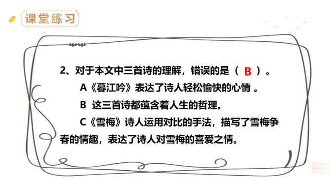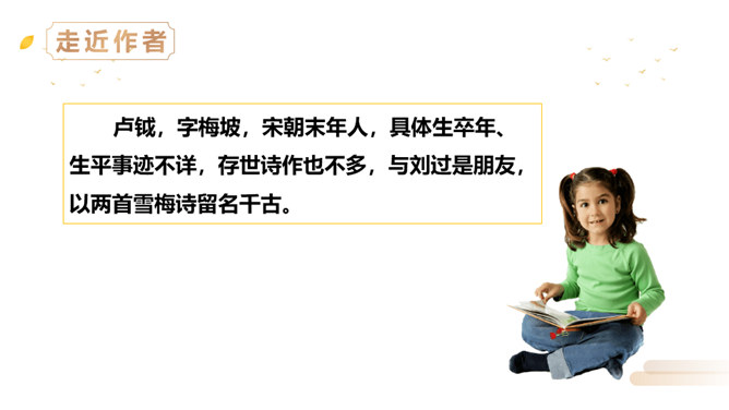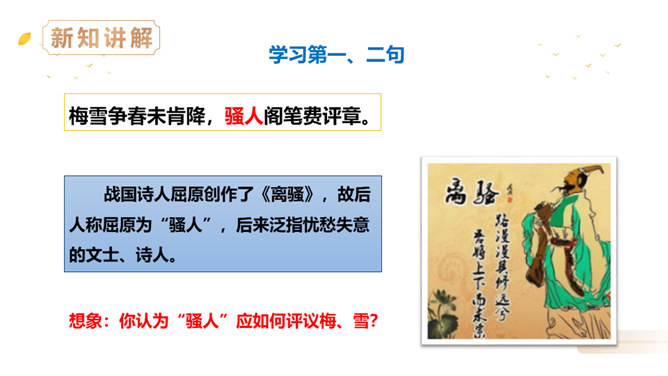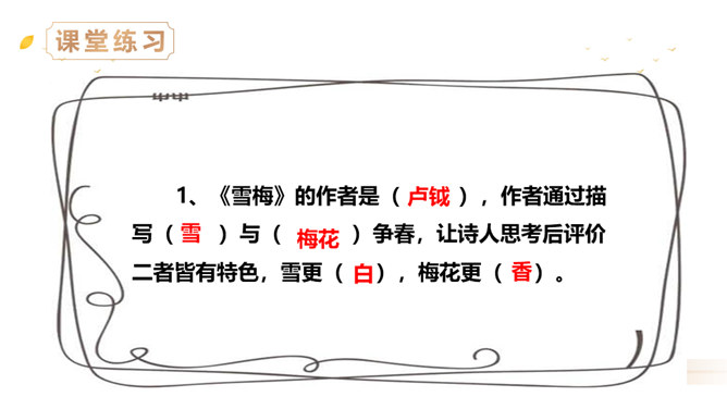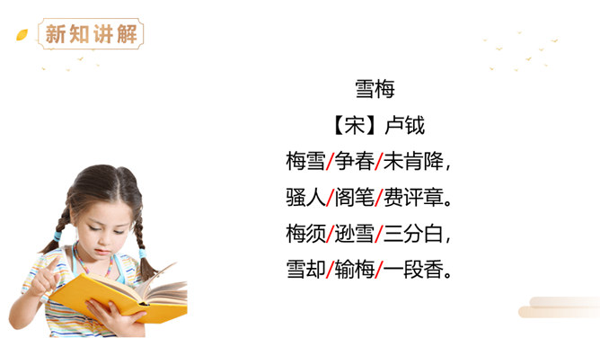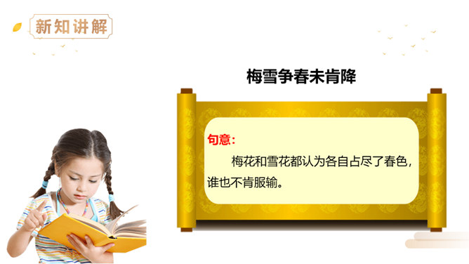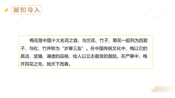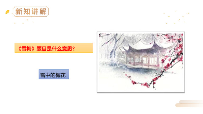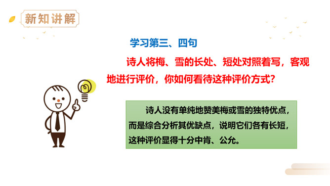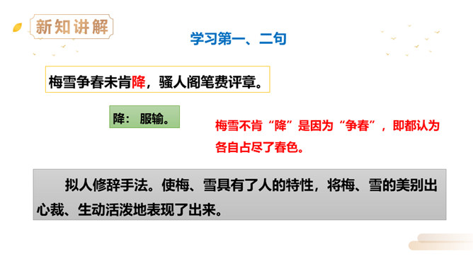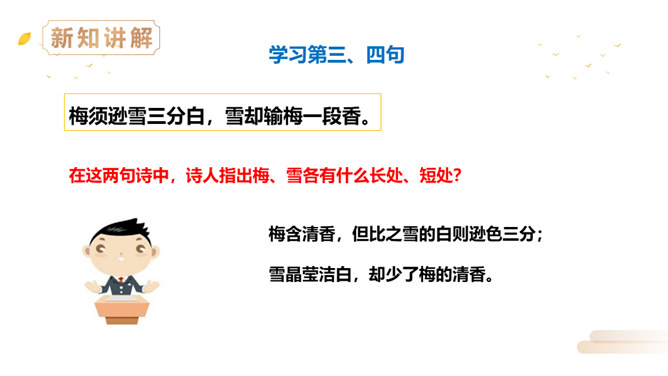 梅花自古就是中华民族的精神象征。别的花都是春天开,它却不一样,越是寒冷,越是风欺雪压,它就开得越精神,越秀气。所以,它象征着不畏严寒、坚强不屈的精神品质。希望我们像梅花一样也能不畏严寒,在艰苦的环境中坚强不屈。1、正确、流利、有感情地朗读古诗。背诵整首古诗。2、借助生活事例,说说你是怎么理解“梅须逊雪三分白,雪却输梅一段香”的?诗人将梅、雪的长处、短处对照着写,客观地进行评价。所属专题:雪梅ppt。