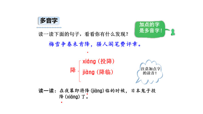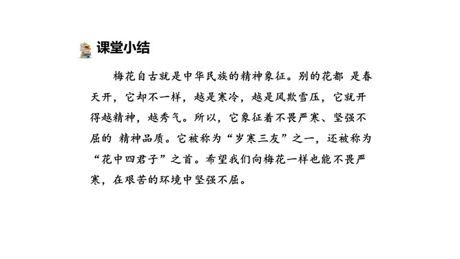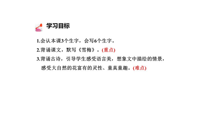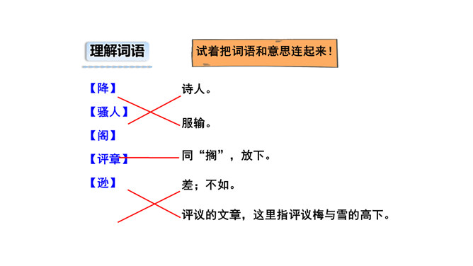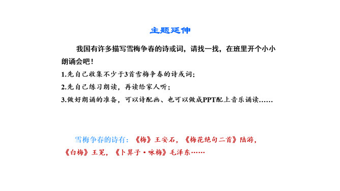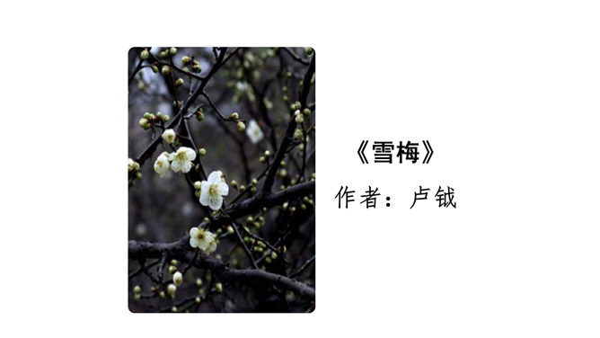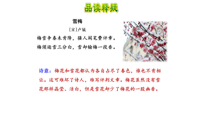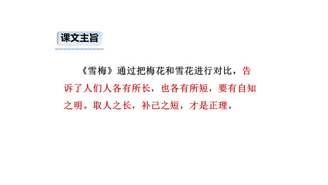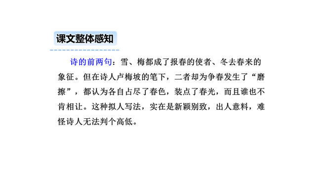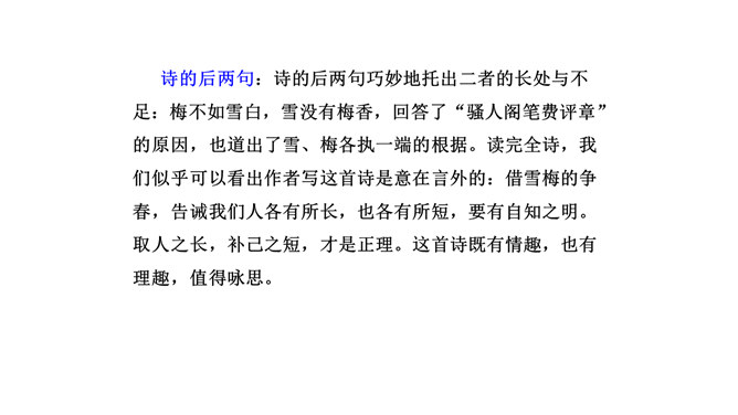 诗的前两句:雪、梅都成了报春的使者、冬去春来的象征。但在诗人卢梅坡的笔下,二者却为争春发生了“磨擦”,都认为各自占尽了春色,装点了春光,而且谁也不肯相让。这种拟人写法,实在是新颖别致,出人意料,难怪诗人无法判个高低。诗的后两句:诗的后两句巧妙地托出二者的长处与不足:梅不如雪白,雪没有梅香,回答了“骚人阁笔费评章”的原因,也道出了雪、梅各执一端的根据。所属专题:雪梅ppt。