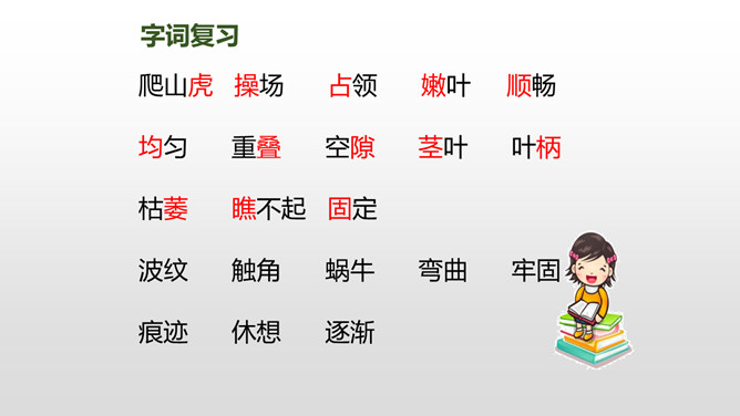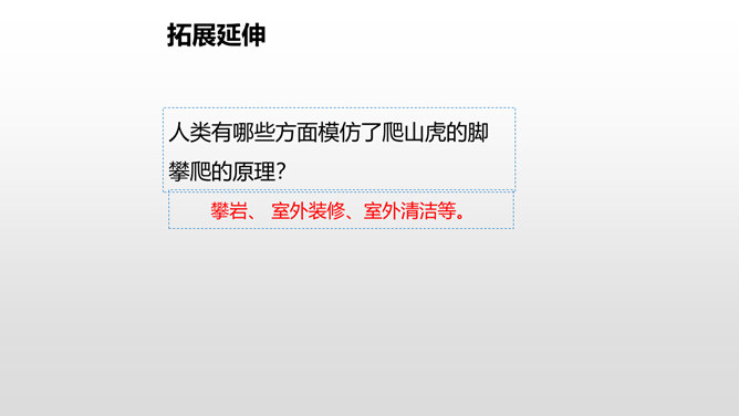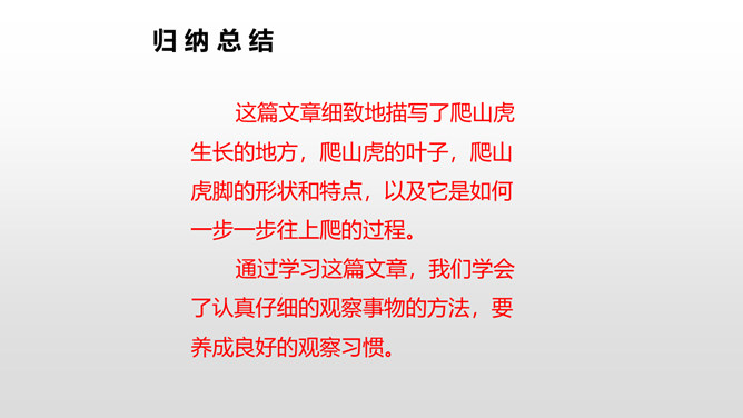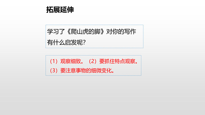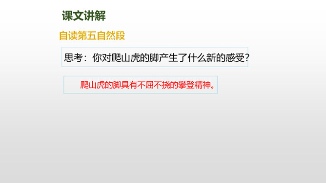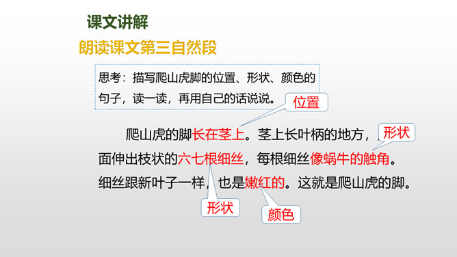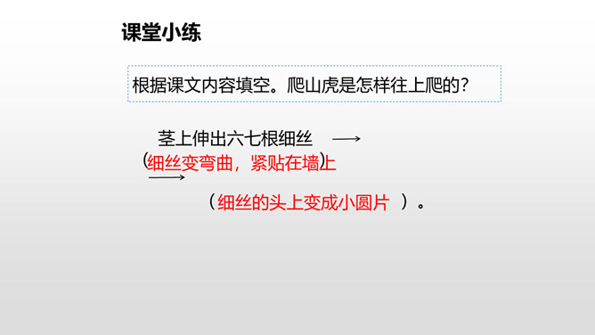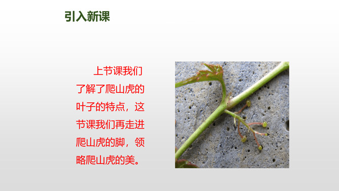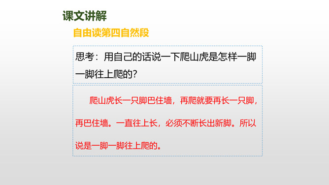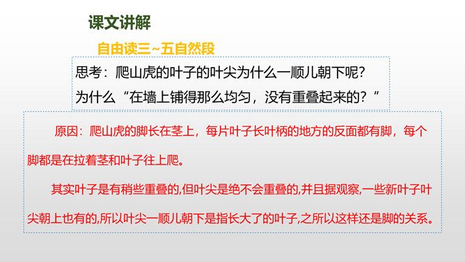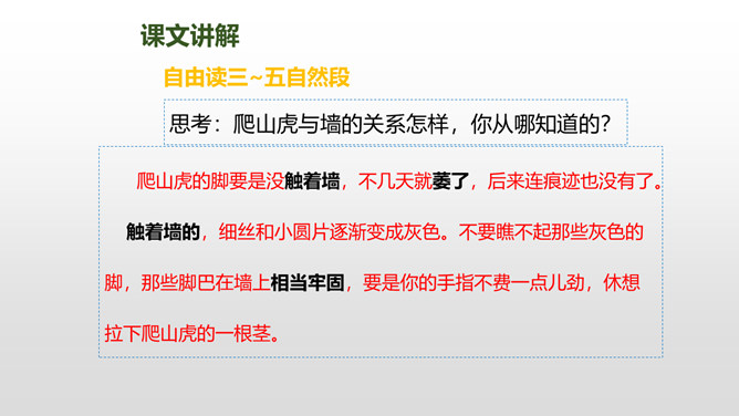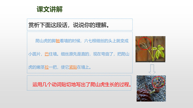 上节课我们了解了爬山虎的叶子的特点,这节课我们再走进爬山虎的脚,领略爬山虎的美。思考:描写爬山虎脚的位置、形状、颜色的句子,读一读,再用自己的话说说。赏析下面这段话,说说你的理解。运用几个动词贴切地写出了爬山虎生长的过程。思考:用自己的话说一下爬山虎是怎样一脚一脚往上爬的?思考:爬山虎与墙的关系怎样,你从哪知道的?爬山虎的叶子的叶尖为什么一顺儿朝下呢?所属专题:爬山虎的脚ppt。