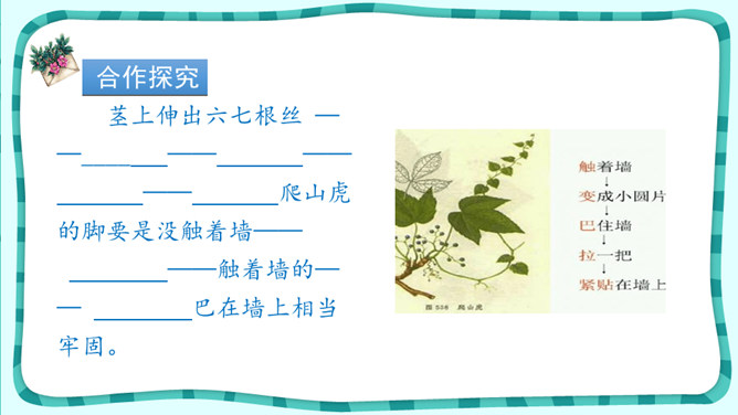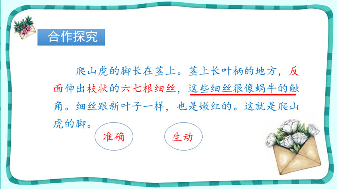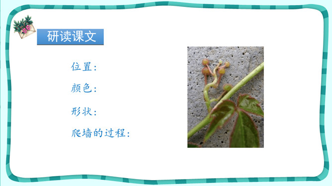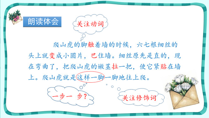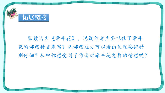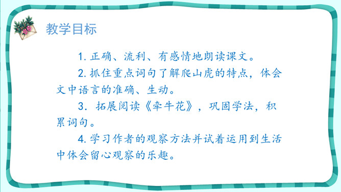 1.正确、流利、有感情地朗读课文。2.抓住重点词句了解爬山虎的特点,体会文中语言的准确、生动。3.拓展阅读《牵牛花》,巩固学法,积累词句。4.学习作者的观察方法并试着运用到生活中体会留心观察的乐趣。 默读选文《牵牛花》,说说作者主要抓住了牵牛花的哪些特点来写?从哪些地方可以看出他观察得特别仔细?从中你感受到了作者对牵牛花怎样的情感呢?用规范的字体工整摘抄两篇文章中生动描写事物的句子。所属专题:爬山虎的脚ppt。