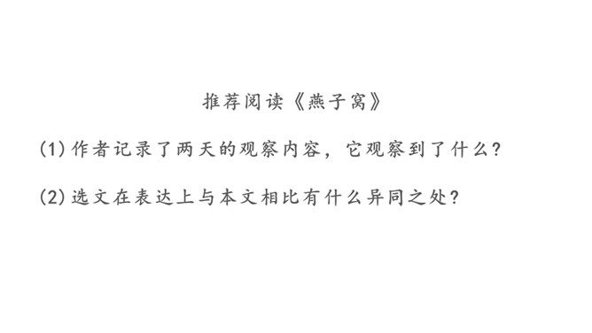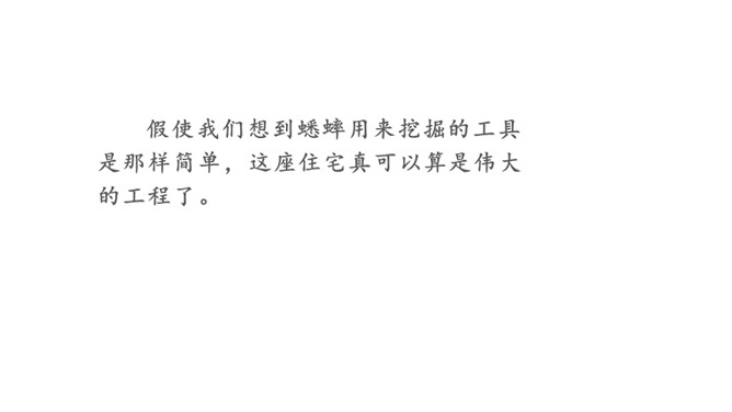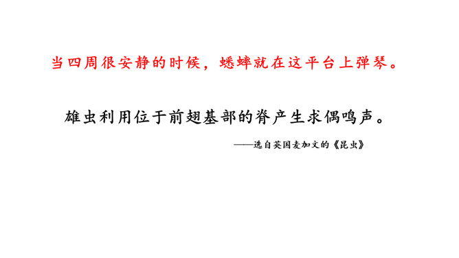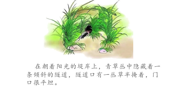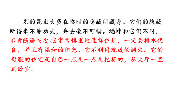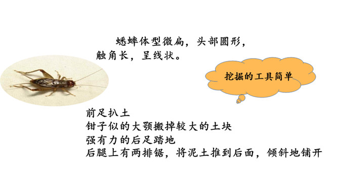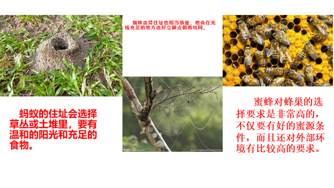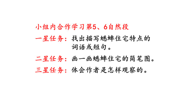 小组内合作学习第5、6自然段。一星任务:找出描写蟋蟀住宅特点的词语或短句。二星任务:画一画蟋蟀住宅的简笔图。三星任务:体会作者是怎样观察的。推荐阅读《燕子窝》(1)作者记录了两天的观察内容,它观察到了什么?(2)选文在表达上与本文相比有什么异同之处?蚂蚁的住址会选择草丛或土堆里,要有温和的阳光和充足的食物。蜘蛛选择住址也相当慎重,他会在光线充足的地方选好立脚点朝南结网。所属专题:蟋蟀的住宅ppt。