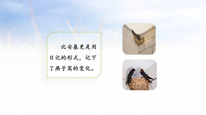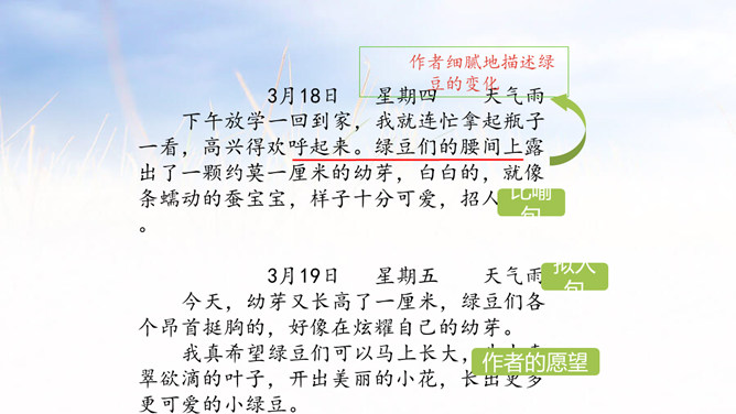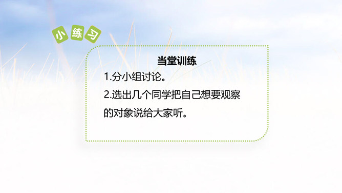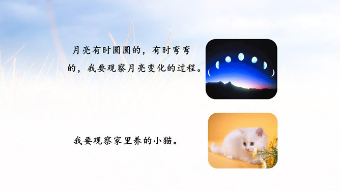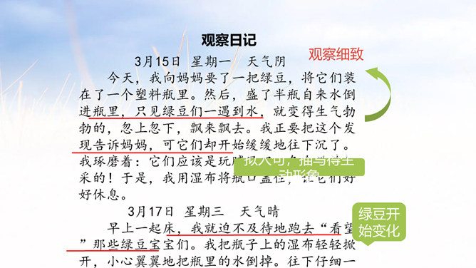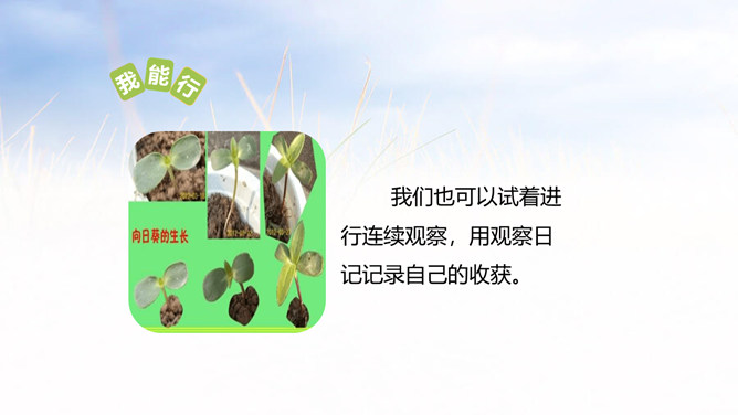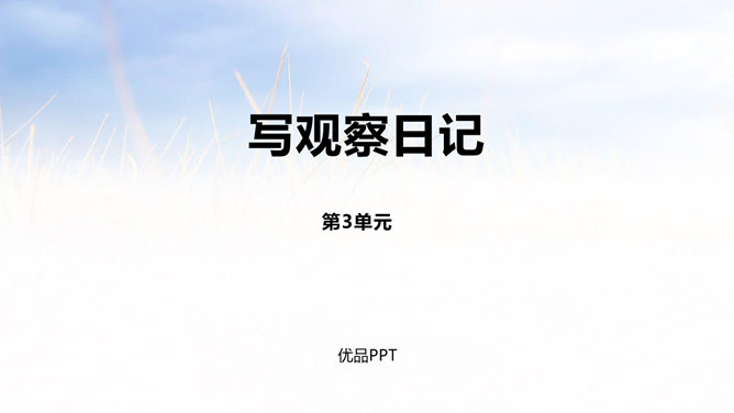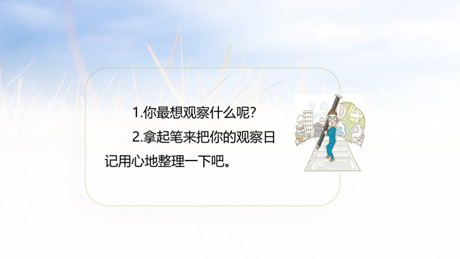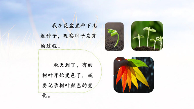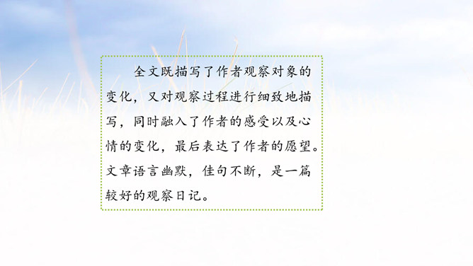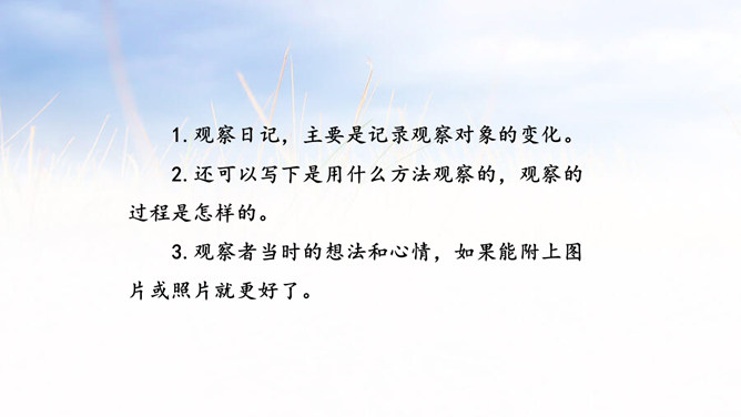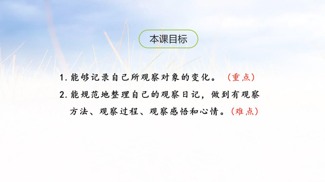 1.能够记录自己所观察对象的变化。 (重点)2.能规范地整理自己的观察日记,做到有观察方法、观察过程、观察感悟和心情。(难点)1.观察日记,主要是记录观察对象的变化。2.还可以写下是用什么方法观察的,观察的过程是怎样的。3.观察者当时的想法和心情,如果能附上图片或照片就更好了。全文既描写了作者观察对象的变化,又对观察过程进行细致地描写,同时融入了作者的感受以及心情的变化,最后表达了作者的愿望。文章语言幽默,佳句不断,是一篇较好的观察日记。所属专题:写观察日记ppt。