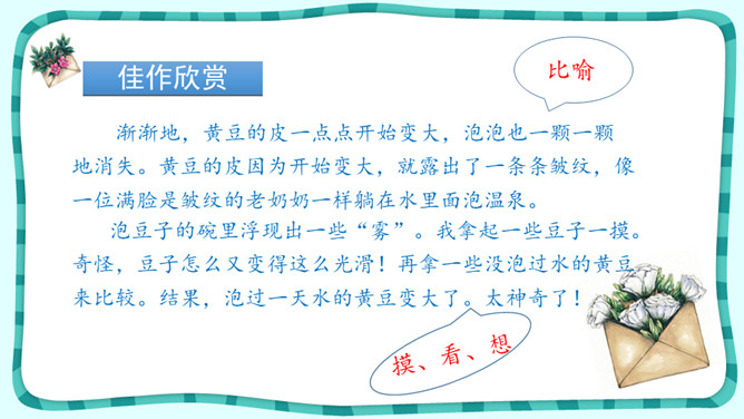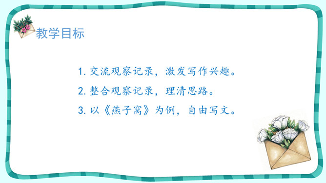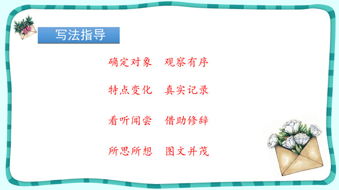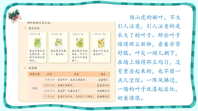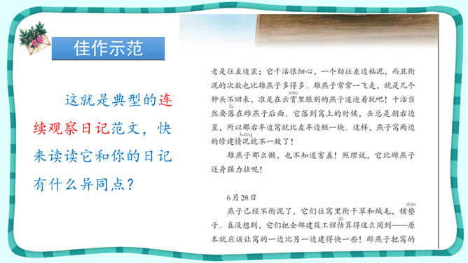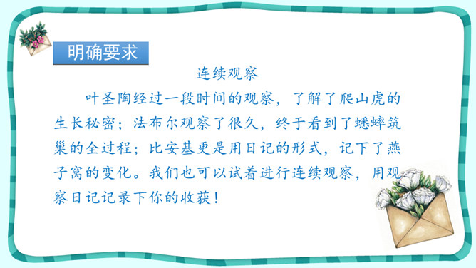 叶圣陶经过一段时间的观察,了解了爬山虎的生长秘密;法布尔观察了很久,终于看到了蟋蟀筑巢的全过程;比安基更是用日记的形式,记下了燕子窝的变化。我们也可以试着进行连续观察,用观察日记记录下你的收获!这就是典型的连续观察日记范文,快来读读它和你的日记有什么异同点?写观察日记一定要像哨兵一样细心,观察要全面,调动多种感官,从多个角度和层面来描写。所属专题:写观察日记ppt。