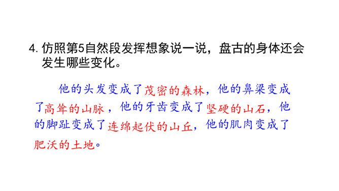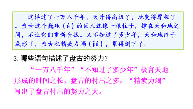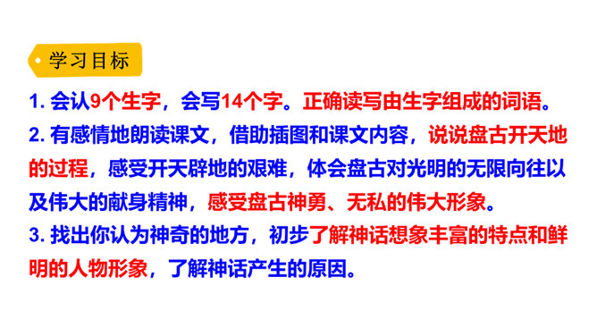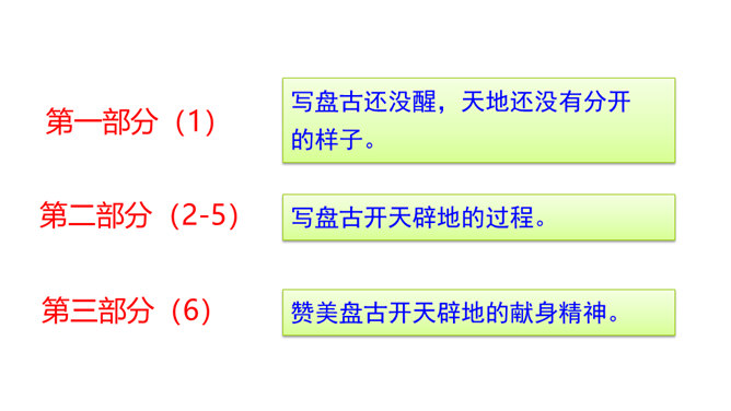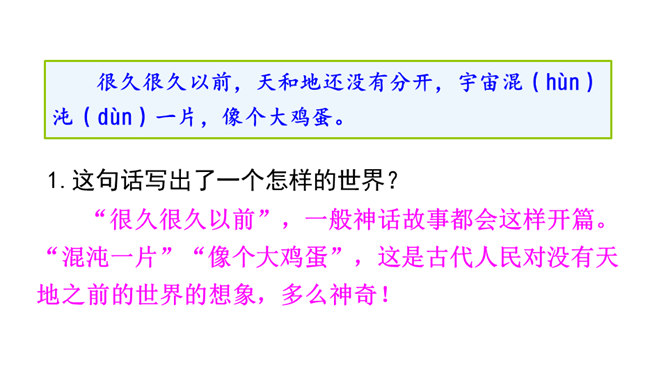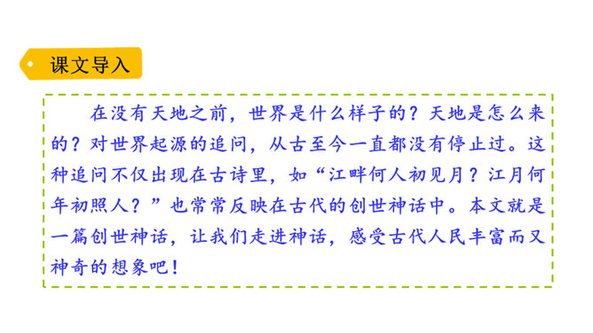在没有天地之前,世界是什么样子的?天地是怎么来的?对世界起源的追问,从古至今一直都没有停止过。这种追问不仅出现在古诗里,如“江畔何人初见月?江月何年初照人?”也常常反映在古代的创世神话中。本文就是一篇创世神话,让我们走进神话,感受古代人民丰富而又神奇的想象吧!找出你认为神奇的地方,初步了解神话想象丰富的特点和鲜明的人物形象,了解神话产生的原因。所属专题:盘古开天地ppt。