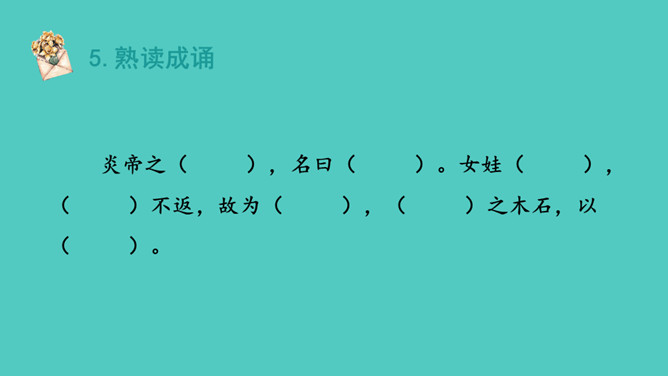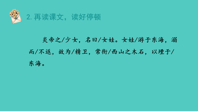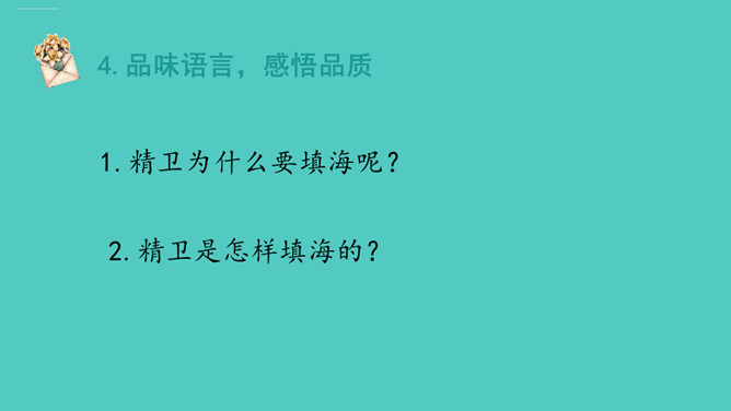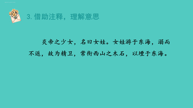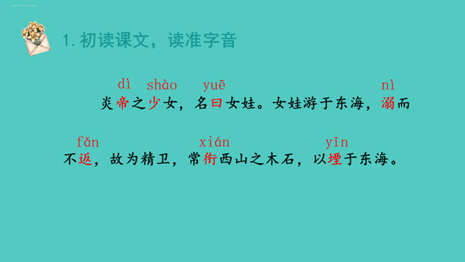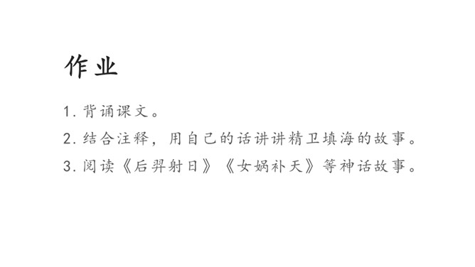 品味语言,感悟品质:1.精卫为什么要填海呢?2.精卫是怎样填海的?精卫给你留下了怎样的印象?作业:1.背诵课文。2.结合注释,用自己的话讲讲精卫填海的故事。3.阅读《后羿射日》《女娲补天》等神话故事。所属专题:精卫填海ppt。