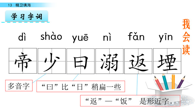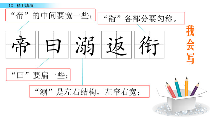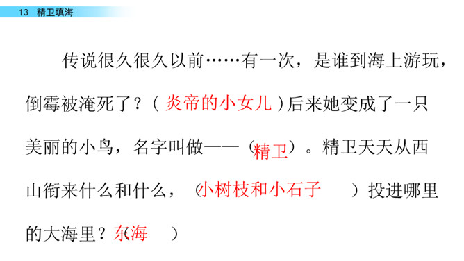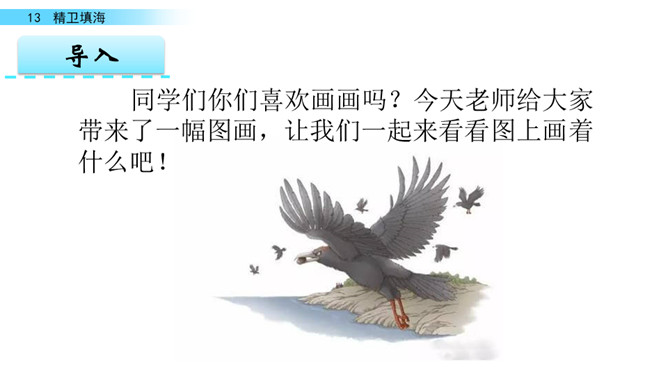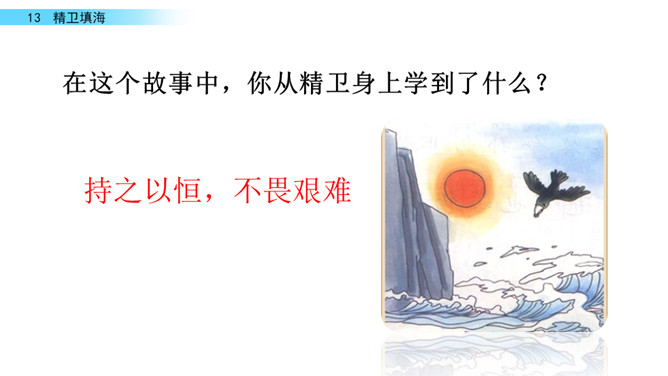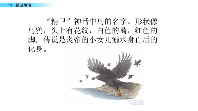 同学们你们喜欢画画吗?今天老师给大家带来了一幅图画,让我们一起来看看图上画着什么吧!“曰”比“日”稍扁一些。“返”—“饭” 是形近字。“帝”的中间要宽一些;“衔”各部分要匀称。“溺”是左右结构,左窄右宽。在这个故事中,你从精卫身上学到了什么?持之以恒,不畏艰难。“精卫”神话中鸟的名字。形状像乌鸦,头上有花纹,白色的嘴,红色的脚,传说是炎帝的小女儿溺水身亡后的化身。所属专题:精卫填海ppt。