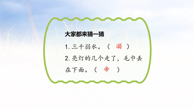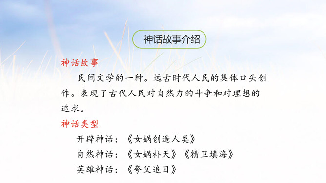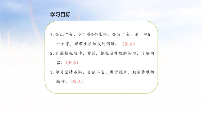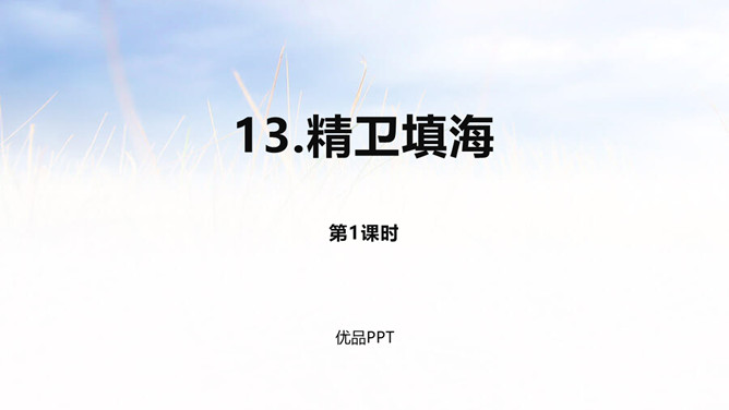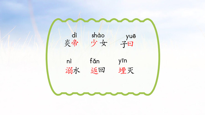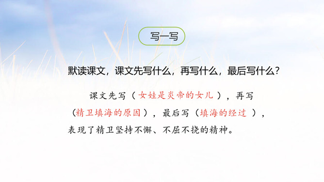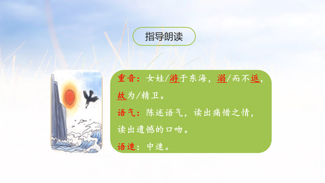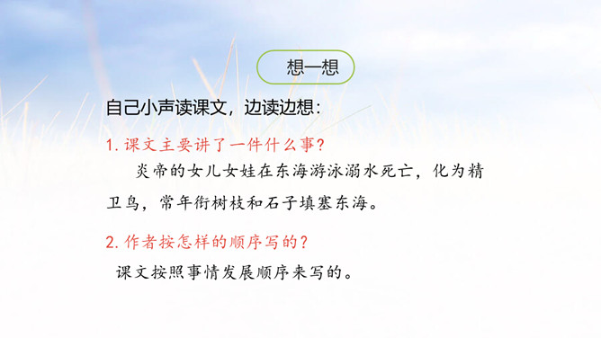 1.会认“帝、少”等6个生字,会写“帝、溺”等5个生字,理解生字组成的词语。 (重点)2.有感情地朗读、背诵,根据注释理解词句,了解内容。(重点)3.学习坚持不懈、自强不息、勇于抗争、勤劳勇敢的精神。(难点)自己小声读课文,边读边想:1.课文主要讲了一件什么事?炎帝的女儿女娃在东海游泳溺水死亡,化为精卫鸟,常年衔树枝和石子填塞东海。2.作者按怎样的顺序写的?课文按照事情发展顺序来写的。所属专题:精卫填海ppt。