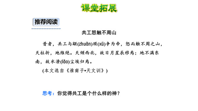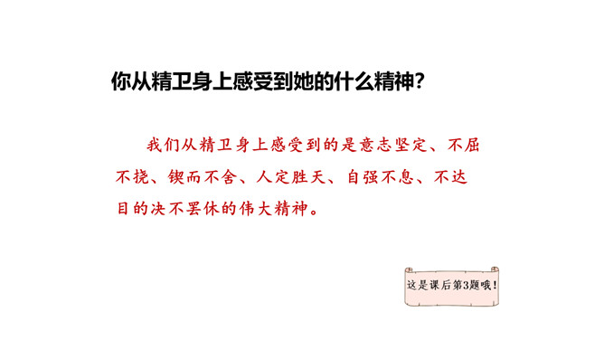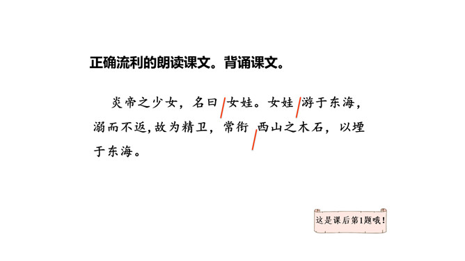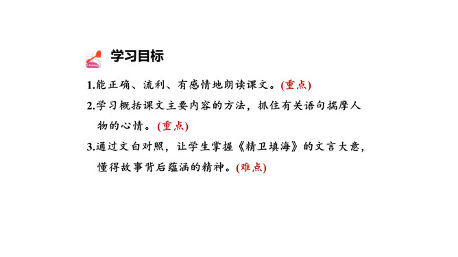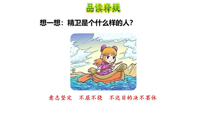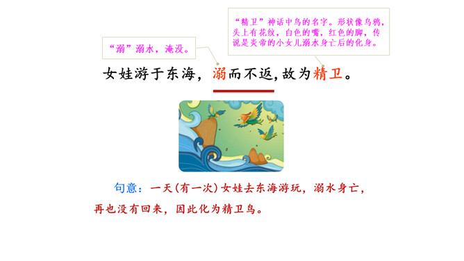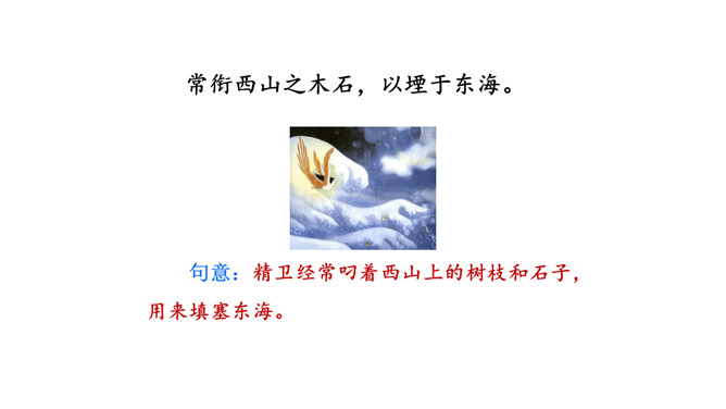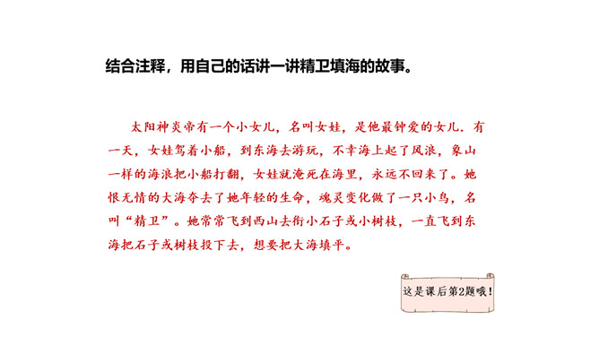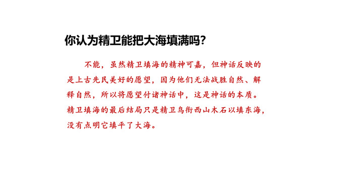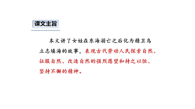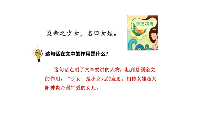 这句话在文中的作用是什么?句话点明了文章要讲的人物,起到总领全文的作用,“少女”是小女儿的意思。相传女娃是太阳神炎帝最钟爱的女儿。精卫填海的起因是什么?在文中找出来。你认为精卫能把大海填满吗?不能,虽然精卫填海的精神可嘉,但神话反映的是上古先民美好的愿望,因为他们无法战胜自然、解释自然,所以将愿望付诸神话中,这是神话的本质。精卫填海的最后结局只是精卫鸟衔西山木石以填东海,没有点明它填平了大海。所属专题:精卫填海ppt。