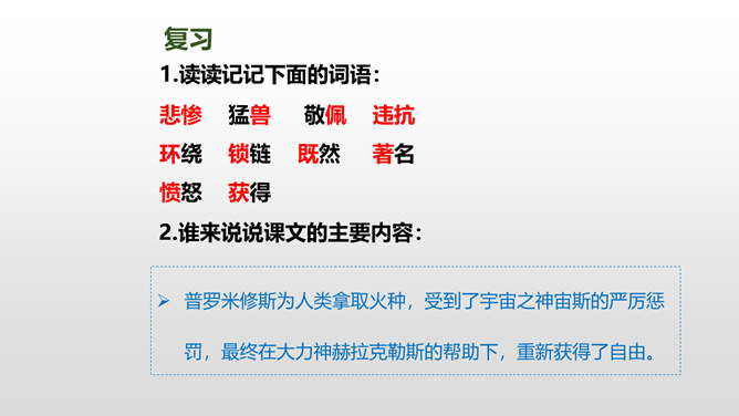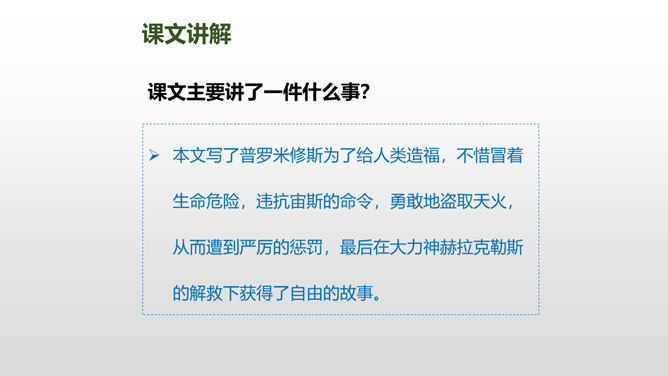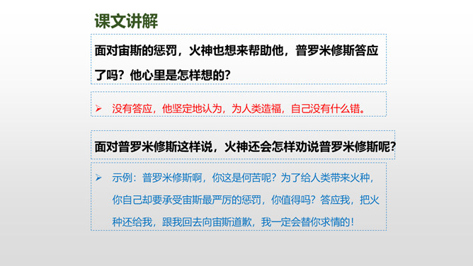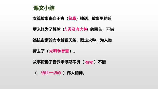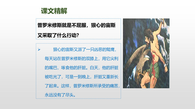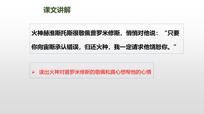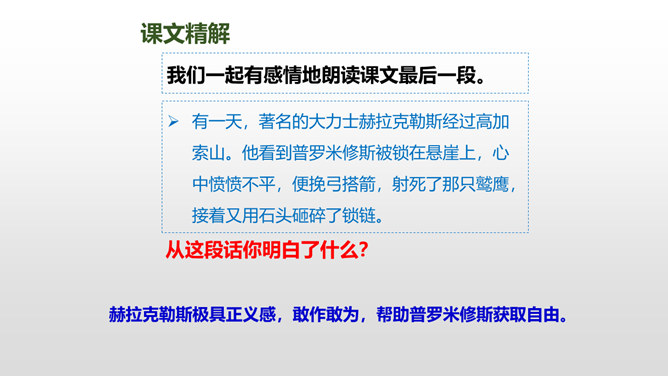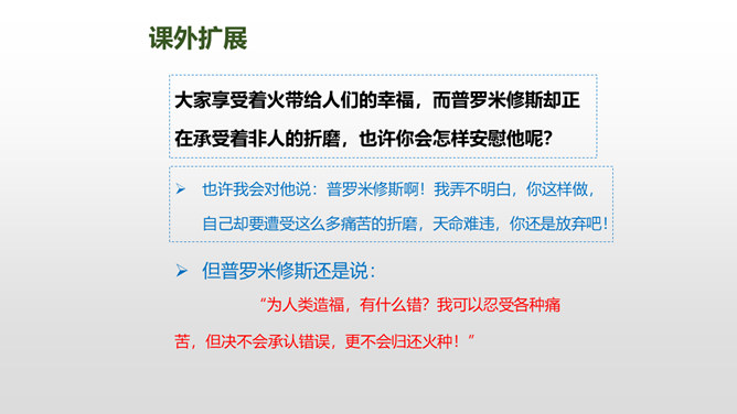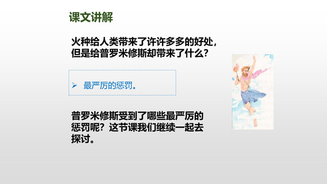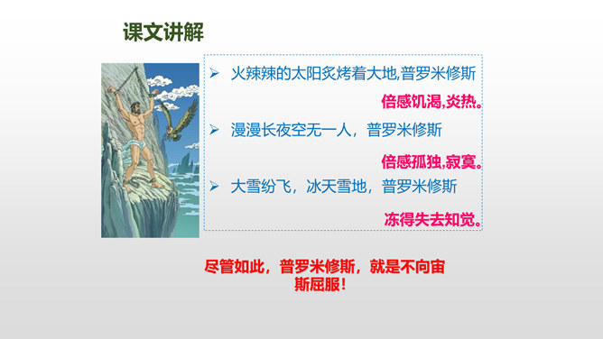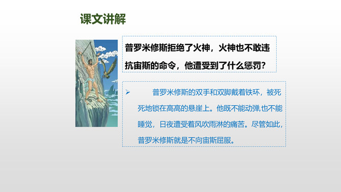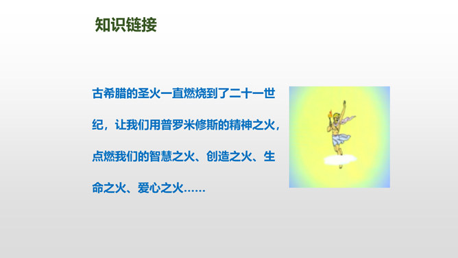 普罗米修斯为人类拿取火种,受到了宇宙之神宙斯的严厉惩罚,最终在大力神赫拉克勒斯的帮助下,重新获得了自由。本文写了普罗米修斯为了给人类造福,不惜冒着生命危险,违抗宙斯的命令,勇敢地盗取天火,从而遭到严厉的惩罚,最后在大力神赫拉克勒斯的解救下获得了自由的故事。 面对普罗米修斯这样说,火神还会怎样劝说普罗米修斯呢?你这是何苦呢?为了给人类带来火种,你自己却要承受宙斯最严厉的惩罚,你值得吗?所属专题:普罗米修斯ppt。