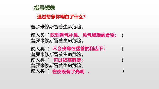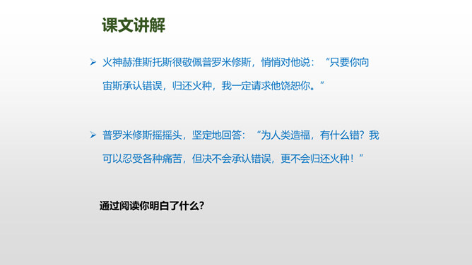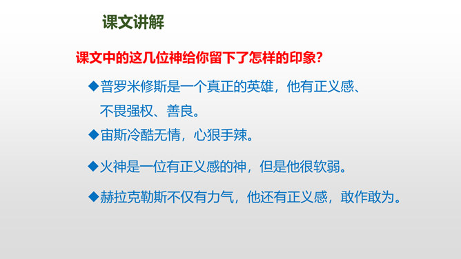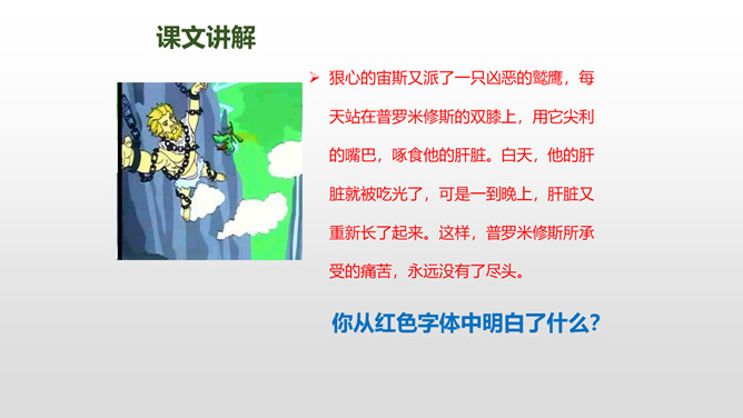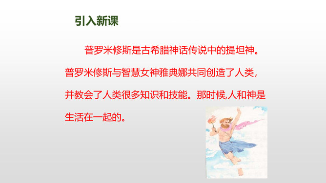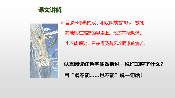 普罗米修斯是古希腊神话传说中的提坦神。普罗米修斯与智慧女神雅典娜共同创造了人类,并教会了人类很多知识和技能。那时候,人和神是生活在一起的。1、朗读课文,难读的词句多读几遍,并给课文标上小节号。2、圈画出神话中出现的众神,想想他们之间发生了哪些事?认真阅读红色字体然后说一说你知道了什么?用“既不能……也不能”说一句话!学习完本课,写写你想对普罗米修斯说的话。所属专题:普罗米修斯ppt。