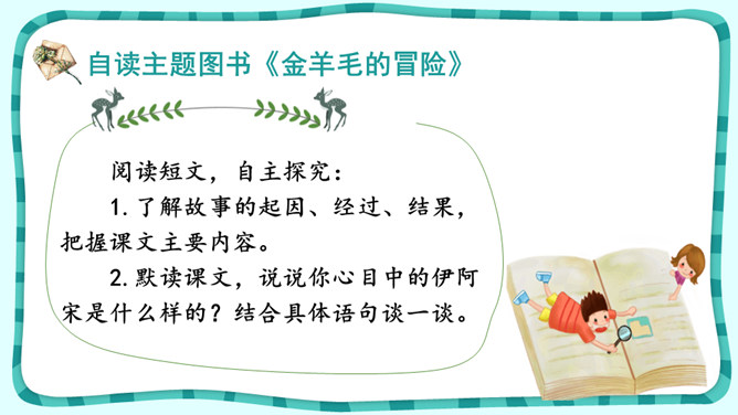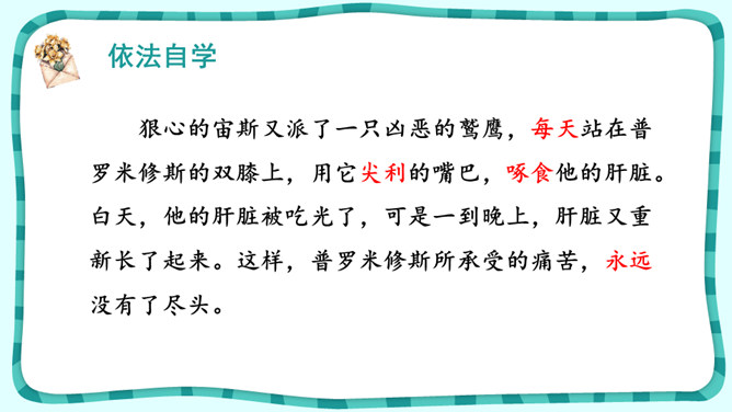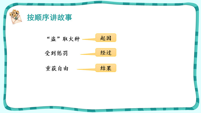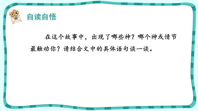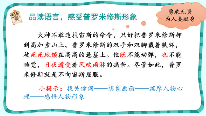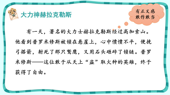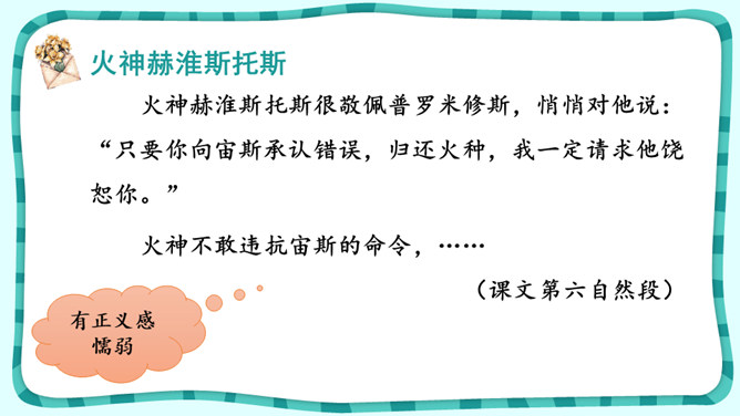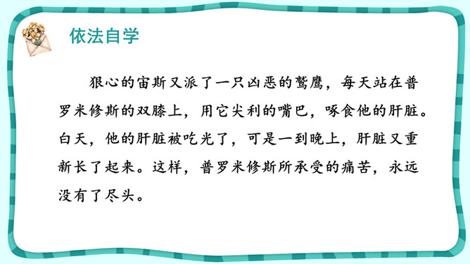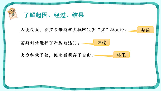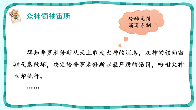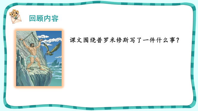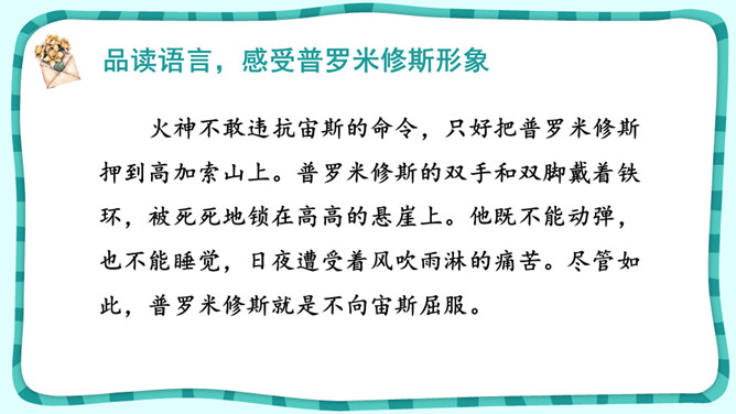 课文围绕普罗米修斯写了一件什么事?人类没火,普罗希修斯就去找阿波罗“盗”取火种。宙斯对他进行了严厉地惩罚。大力神救了他,他重新获得了自由。把起因、经过、结果巧妙地串起来就是文章的主要内容。在这个故事中,出现了哪些神?哪个神或情节最触动你?请结合文中的具体语句谈一谈。自主探究:1.了解故事的起因、经过、结果,把握课文主要内容。2.默读课文,说说你心目中的伊阿宋是什么样的?结合具体语句谈一谈。所属专题:普罗米修斯ppt。