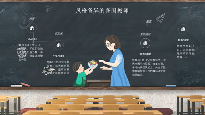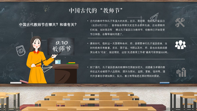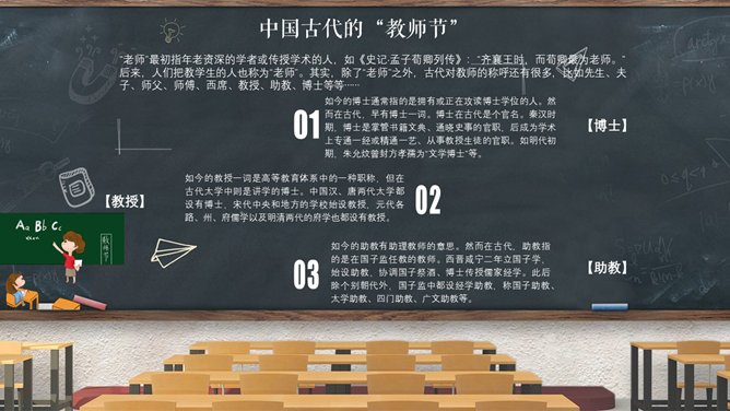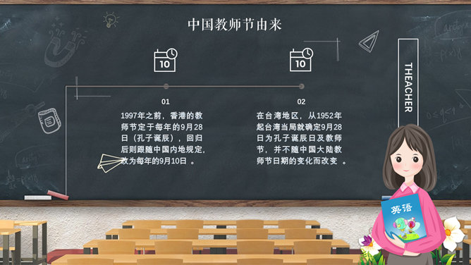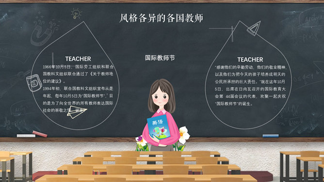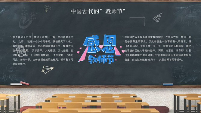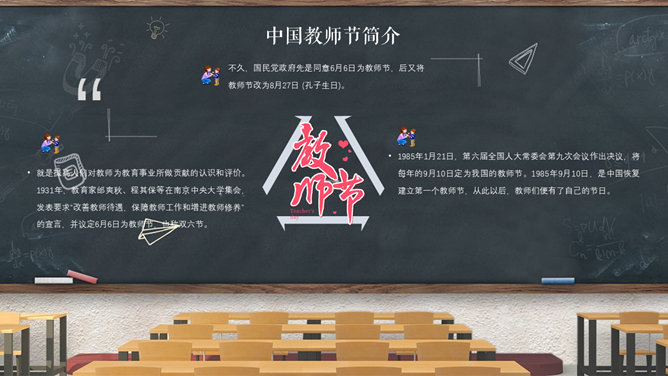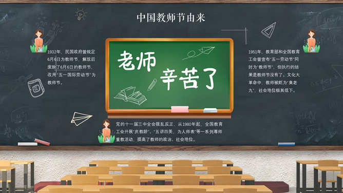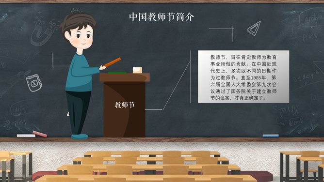 教室黑板教师节PPT模板。一套庆祝教师节主题幻灯片模板,教室黑板素材设计,适合感恩老师教育培养等内容。