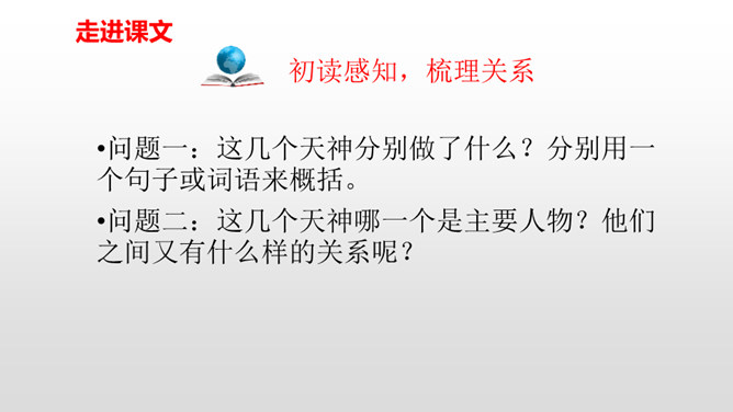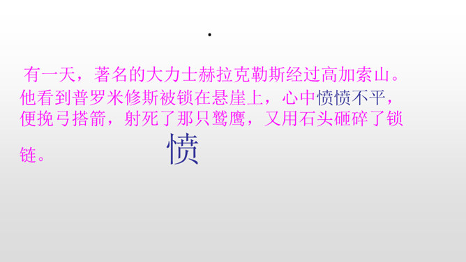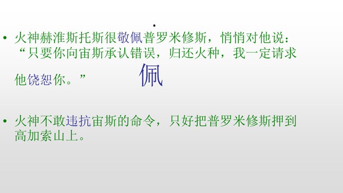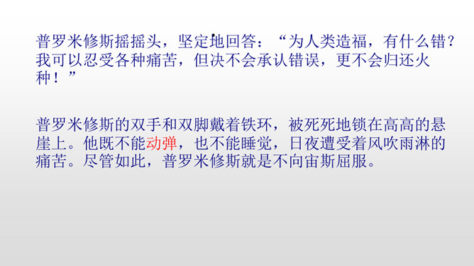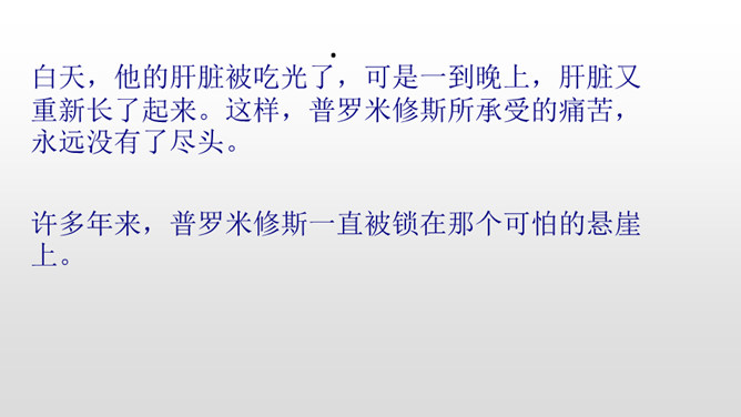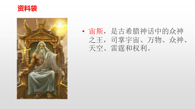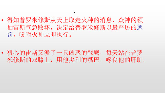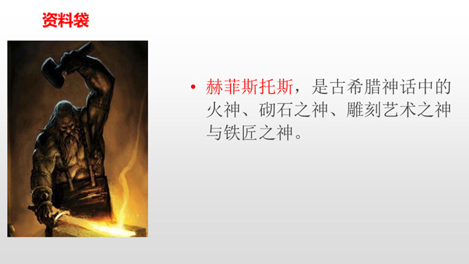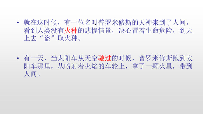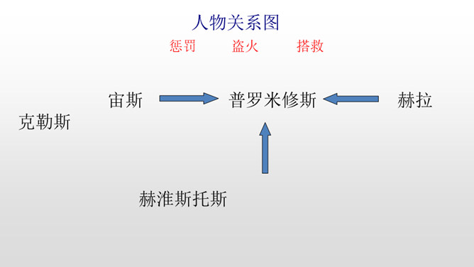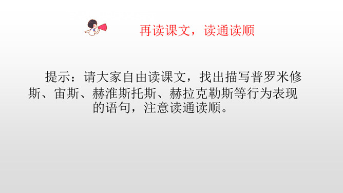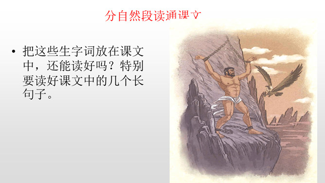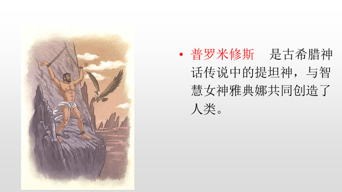 问题一:这几个天神分别做了什么?分别用一个句子或词语来概括。问题二:这几个天神哪一个是主要人物?他们之间又有什么样的关系呢?提示:请大家自由读课文,找出描写普罗米修斯、宙斯、赫淮斯托斯、赫拉克勒斯等行为表现的语句,注意读通读顺。把这些生字词放在课文中,还能读好吗?特别要读好课文中的几个长句子。思考:这篇课文围绕着普罗米修斯“盗”火这件事,先写了什么?再写了什么?最后写了什么?所属专题:普罗米修斯ppt。