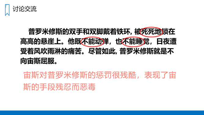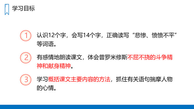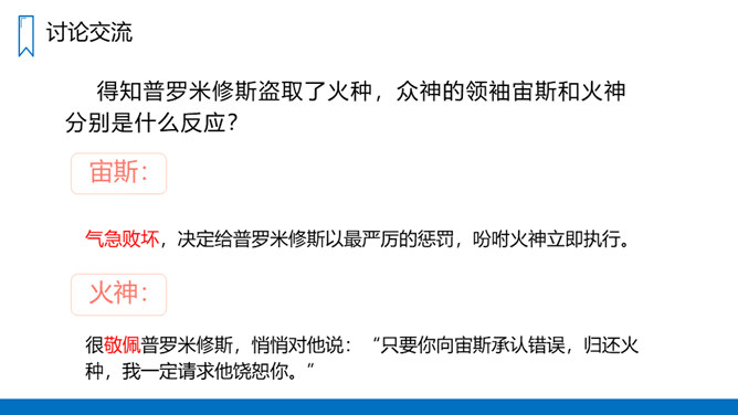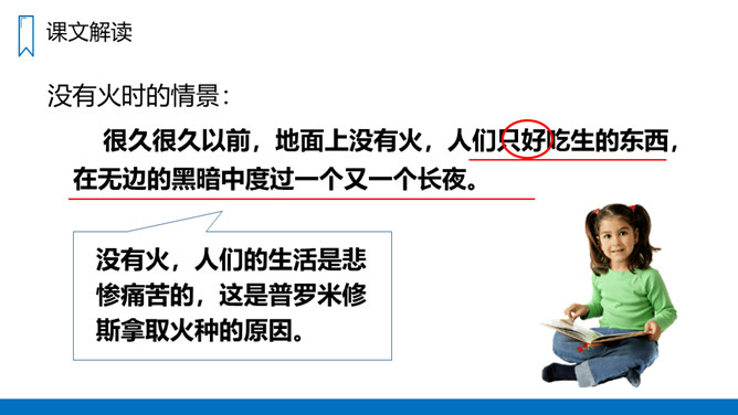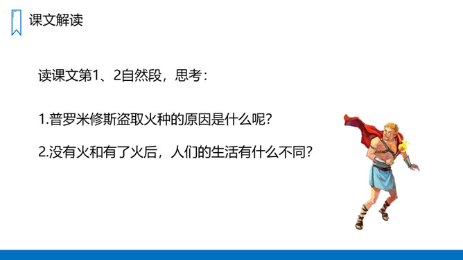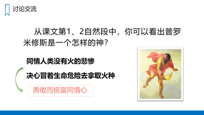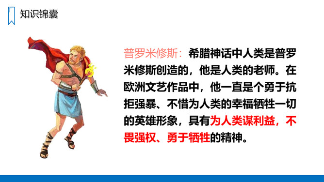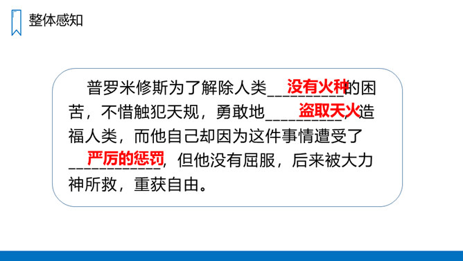 学习概括课文主要内容的方法,抓住有关语句揣摩人物的心情。有感情地朗读课文,体会普罗米修斯不屈不挠的斗争精神和献身精神。认识12个字,会写14个字,正确读写“悲惨、愤愤不平”等词语。读课文第1、2自然段,思考:没有火和有了火后,人们的生活有什么不同?普罗米修斯盗取火种的原因是什么呢?没有火,人们的生活是悲惨痛苦的,这是普罗米修斯拿取火种的原因。省略号表示列举的省略,说明火给人类带来的好处还有很多。所属专题:普罗米修斯ppt。