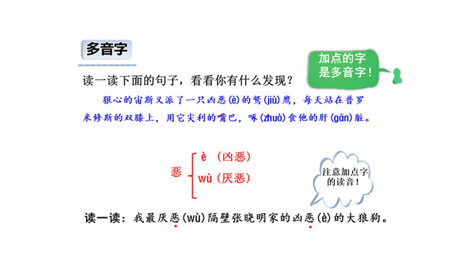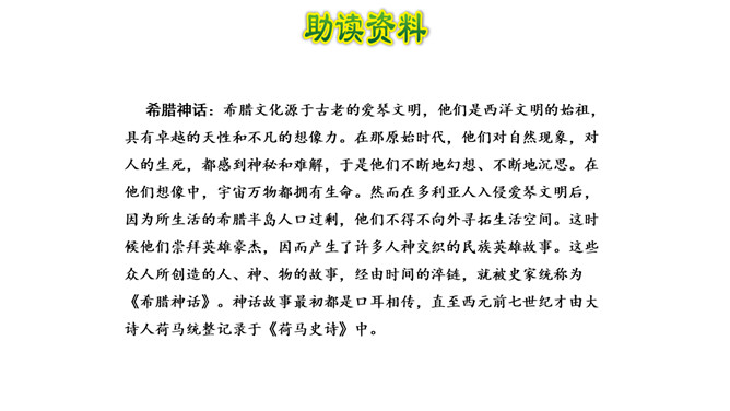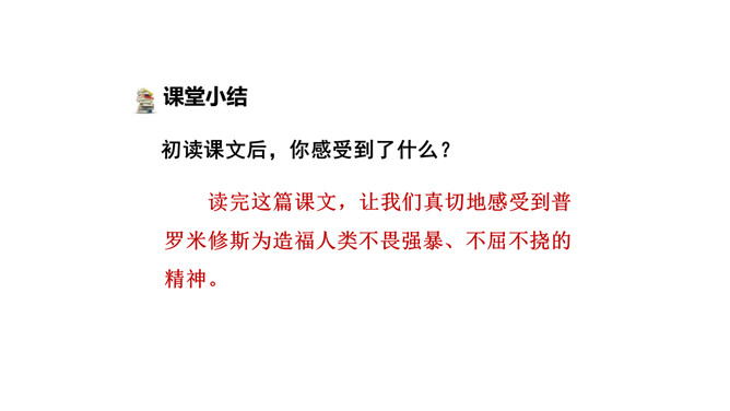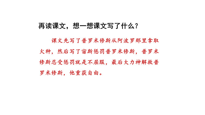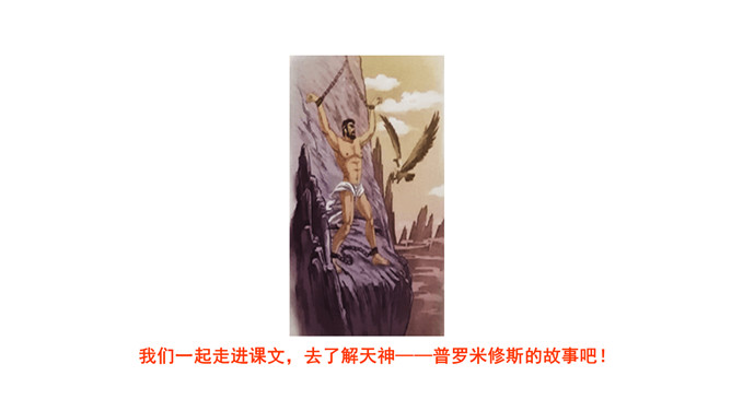 我们一起走进课文,去了解天神——普罗米修斯的故事吧!希腊神话:希腊文化源于古老的爱琴文明,他们是西洋文明的始祖,具有卓越的天性和不凡的想像力。1.会认本课12个生字,会写14个生字,理解生字组成的词语。2.正确、流利、有感情地朗读课文。3.初步感知文意,了解课文内容。课文先写了普罗米修斯从阿波罗那里拿取火种,然后写了宙斯惩罚普罗米修斯,普罗米修斯忍受惩罚就是不屈服,最后大力神解救普罗米修斯,他重获自由。所属专题:普罗米修斯ppt。