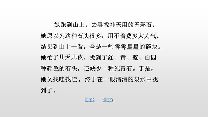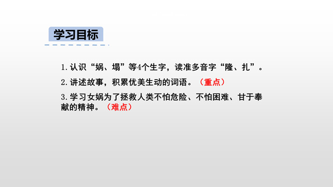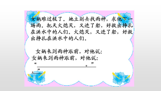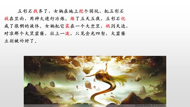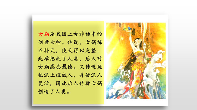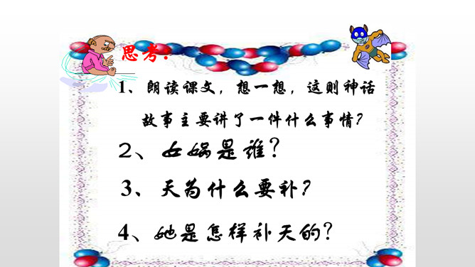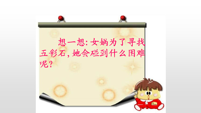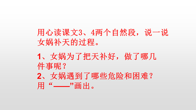 1、朗读课文,想一想,这则神话故事主要讲了一件什么事情?2、女娲是谁?3、天为什么要补?4、她是怎样补天的?自从女娲创造了人,大地上到处是欢歌笑语,人们一直过着快乐幸福的生活。用心读课文3、4两个自然段,说一说女娲补天的过程。1、女娲为了把天补好,做了哪几件事呢?2、女娲遇到了哪些危险和困难?用“——”画出。想一想:女娲为了寻找五彩石,她会碰到什么困难呢?所属专题:女娲补天ppt。