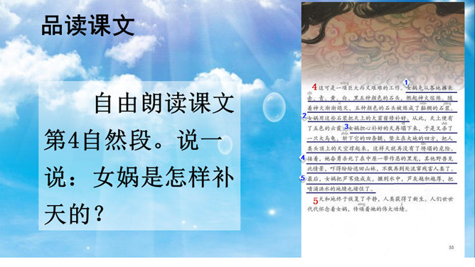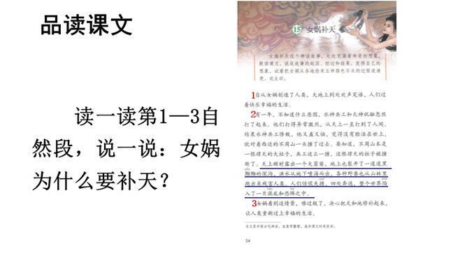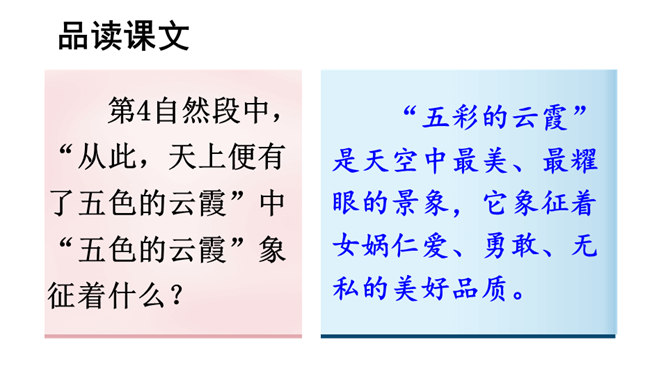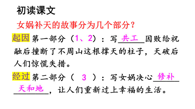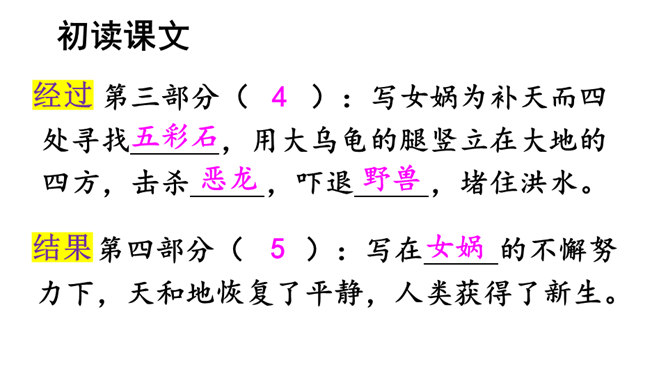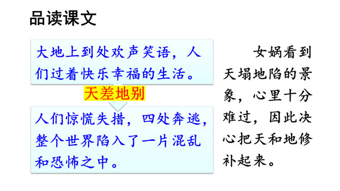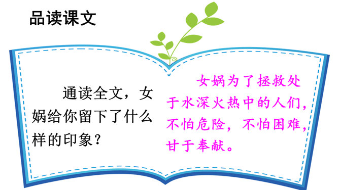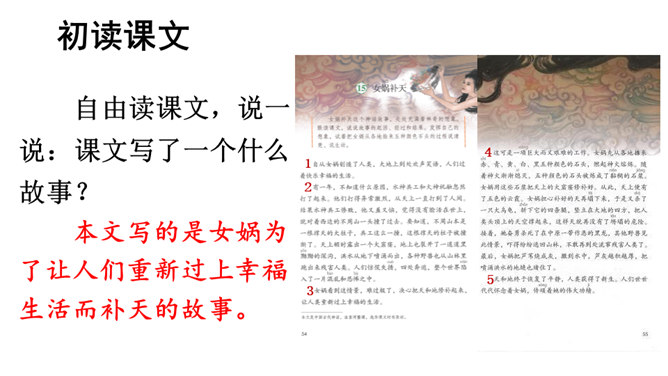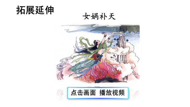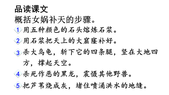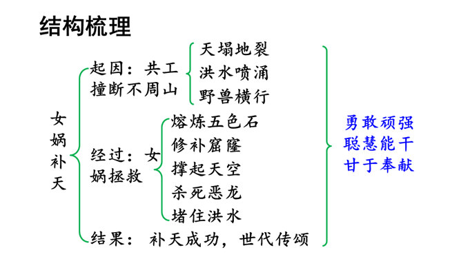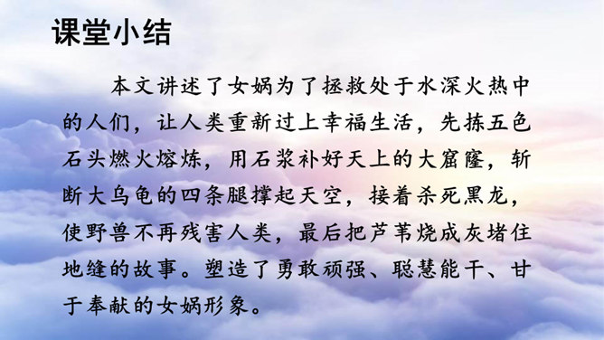 本文讲述了女娲为了拯救处于水深火热中的人们,让人类重新过上幸福生活,先拣五色石头燃火熔炼,用石浆补好天上的大窟窿,斩断大乌龟的四条腿撑起天空,接着杀死黑龙,使野兽不再残害人类,最后把芦苇烧成灰堵住地缝的故事。塑造了勇敢顽强、聪慧能干、甘于奉献的女娲形象。搜集更多的神话故事,与同学分享。联系实际,想一想:女娲的精神使你联想到了什么人?所属专题:女娲补天ppt。
