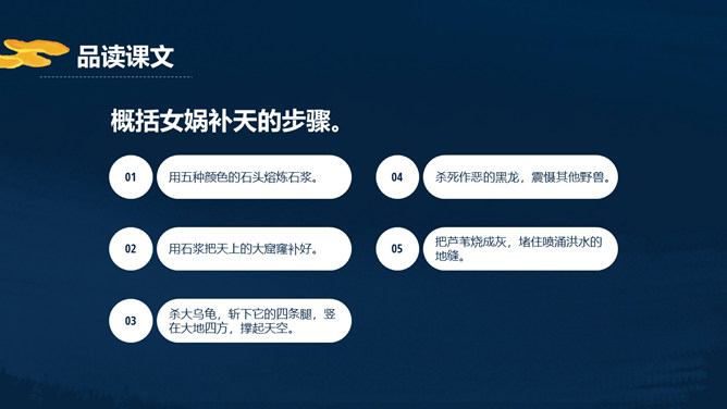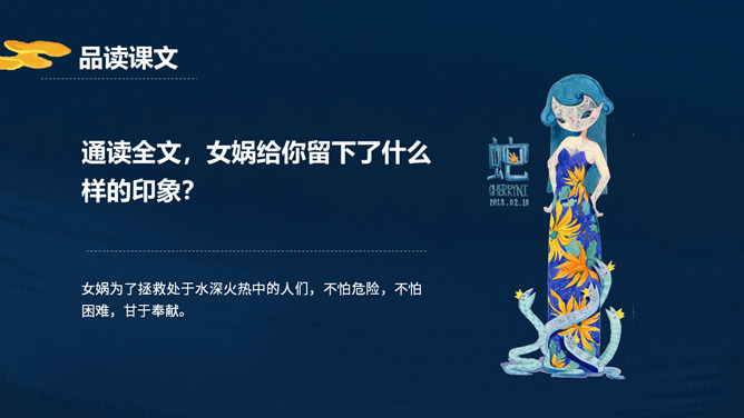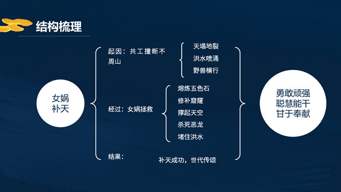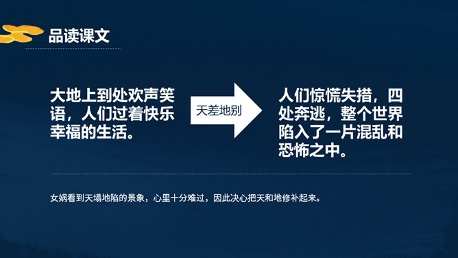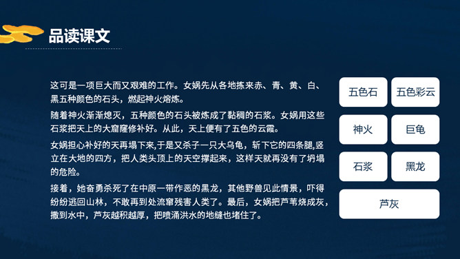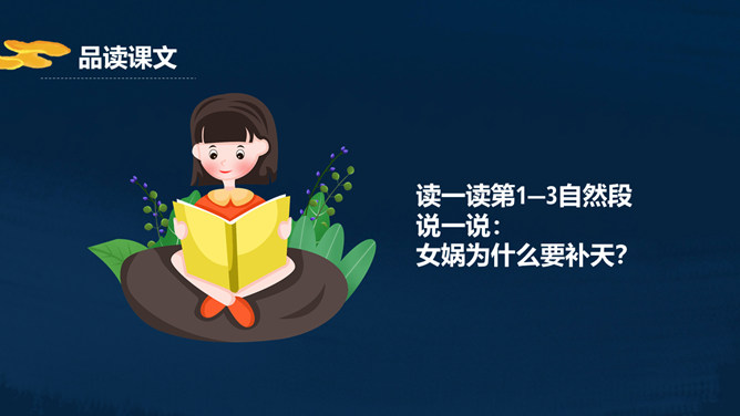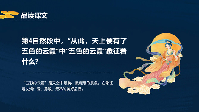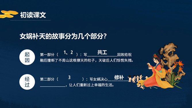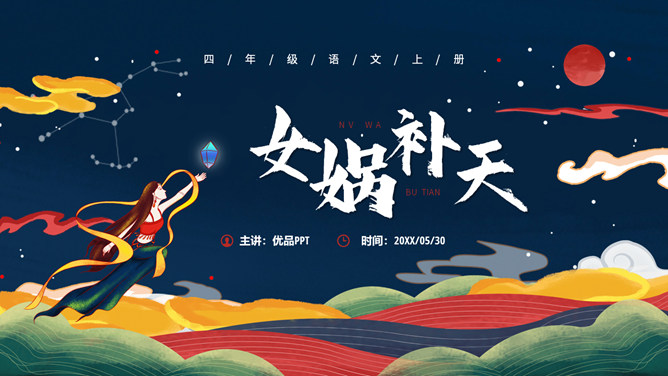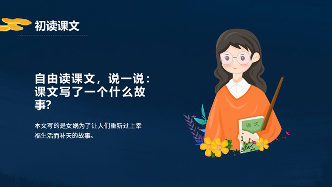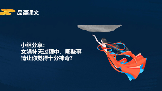 神话中人类的女始祖。相传当天地开辟时,世上没有人类,她用黄土造人。自由读课文,说一说:课文写了一个什么故事?本文写的是女娲为了让人们重新过上幸福生活而补天的故事。女娲补天的故事分为几个部分?读一读第1—3自然段说一说:女娲为什么要补天?自由朗读课文第4自然段。说一说:女娲是怎样补天的?小组分享:女娲补天过程中,哪些事情让你觉得十分神奇?所属专题:女娲补天ppt。