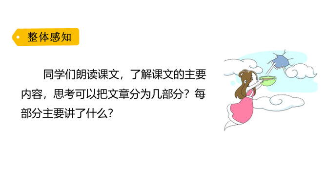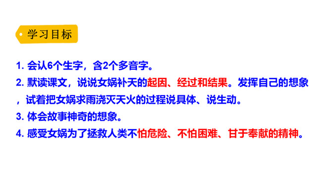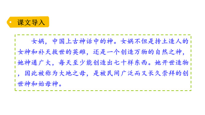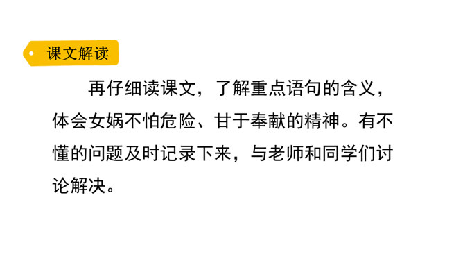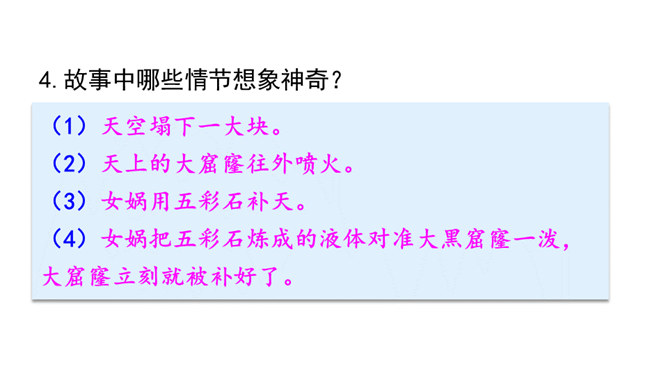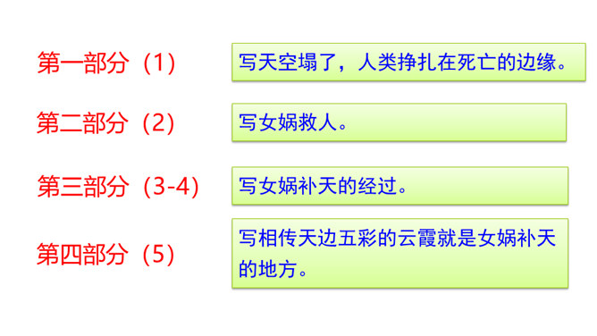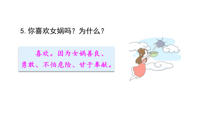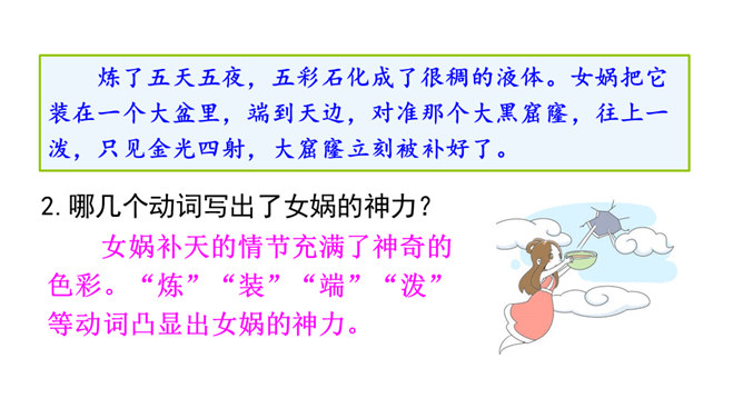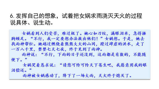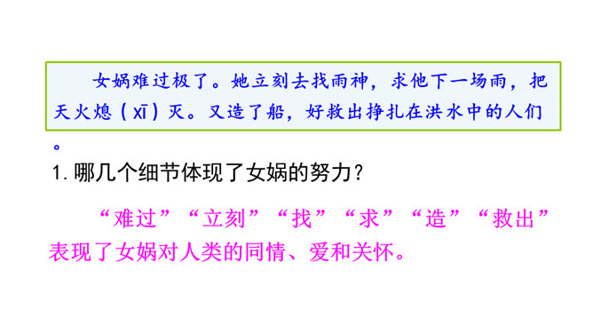 “难过”“立刻”“找”“求”“造”“救出”表现了女娲对人类的同情、爱和关怀。女娲补天的情节充满了神奇的色彩。“炼”“装”“端”“泼”等动词凸显出女娲的神力。起因:天塌地裂,人类被困于水火之中。经过:女娲求雨神来灭天火,又造船救出洪水中的人们,然后决定把天补上。她历经千辛万苦找来五彩石,用神火冶炼成液体,朝天空的大黑窟窿一泼。结果:大窟窿被补好了。怎样才能把女娲求雨浇灭天火的过程说具体、说生动呢?所属专题:女娲补天ppt。