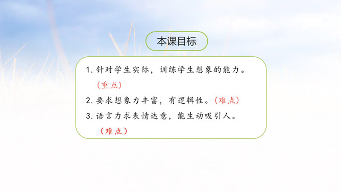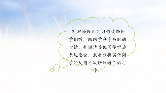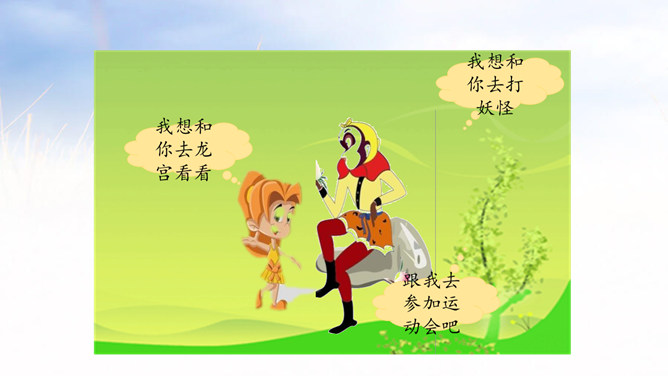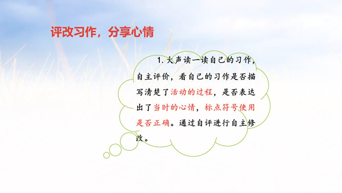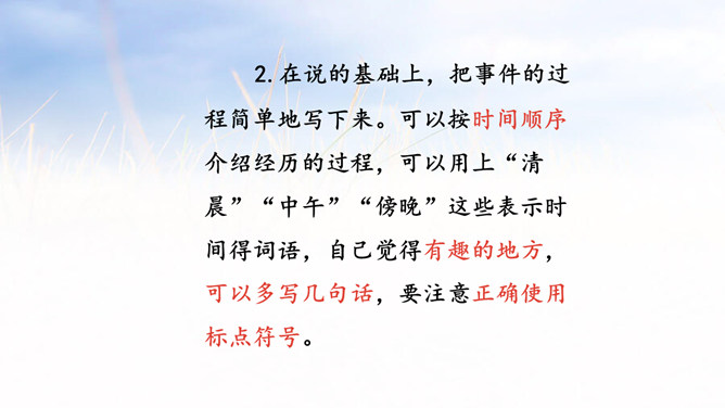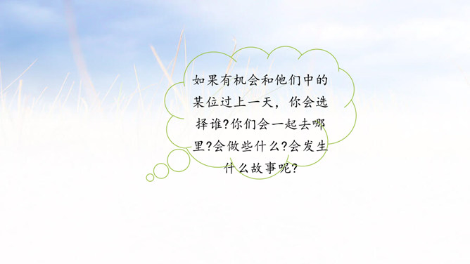 如果有机会和他们中的某位过上一天,你会选择谁?你们会一起去哪里?会做些什么?会发生什么故事呢?在说的基础上,把事件的过程简单地写下来。可以按时间顺序介绍经历的过程,可以用上“清晨”“中午”“傍晚”这些表示时间得词语,自己觉得有趣的地方,可以多写几句话,要注意正确使用标点符号。大声读一读自己的习作,看自己的习作是否描写清楚了活动的过程,是否表达出了当时的心情,标点符号使用是否正确。通过自评进行自主修改。所属专题:我和___过一天ppt。