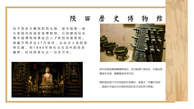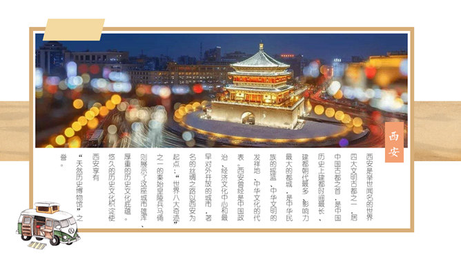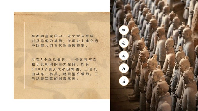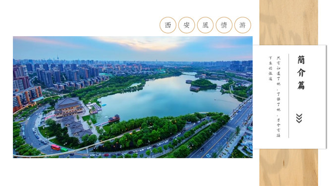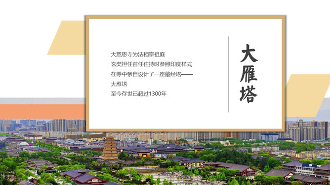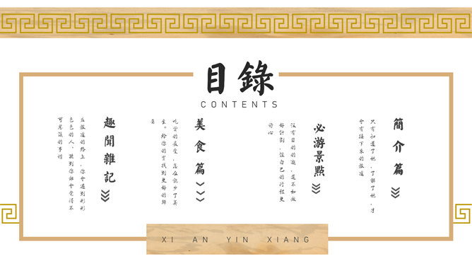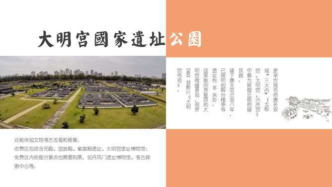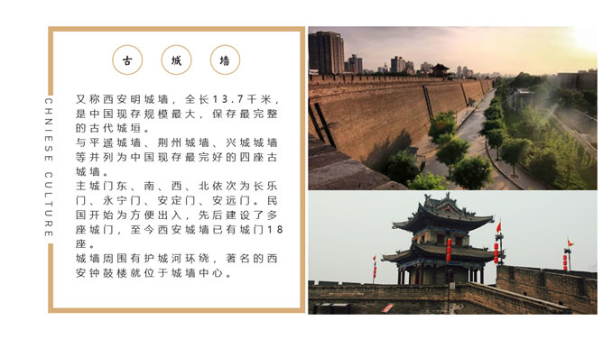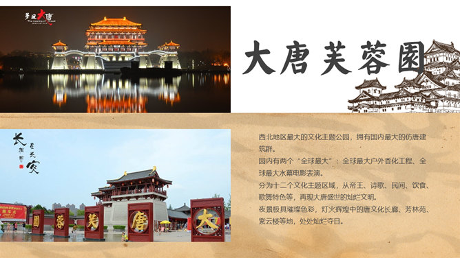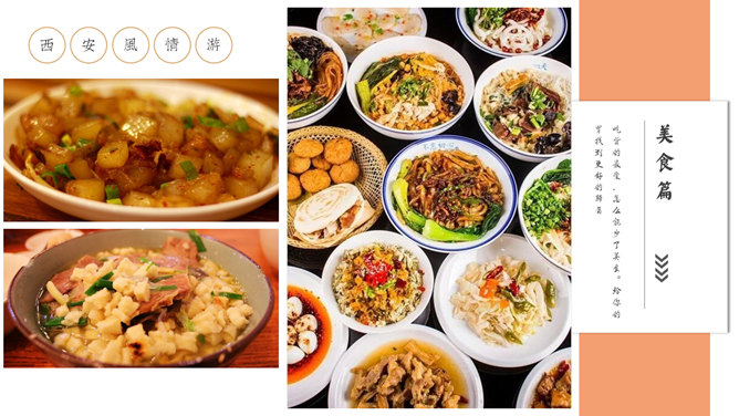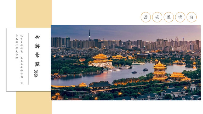 西安旅游攻略景点介绍PPT模板。一套设计精美的旅游攻略幻灯片模板,介绍了西安的必游景点、美食和趣闻。