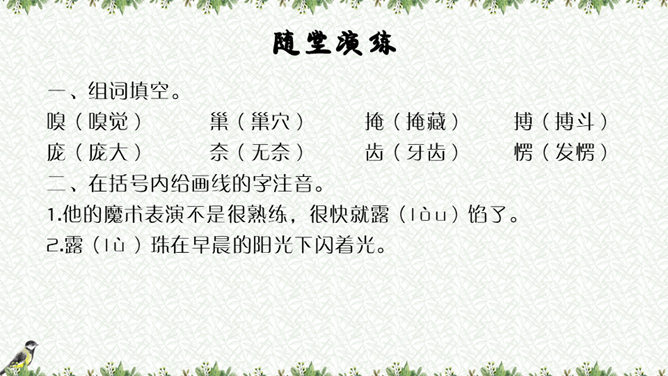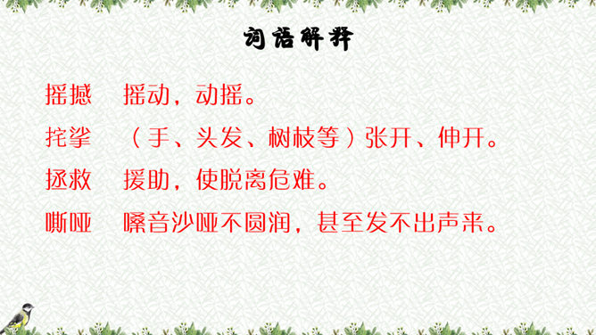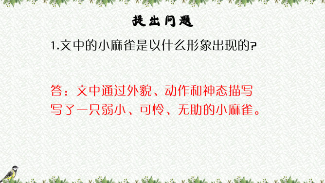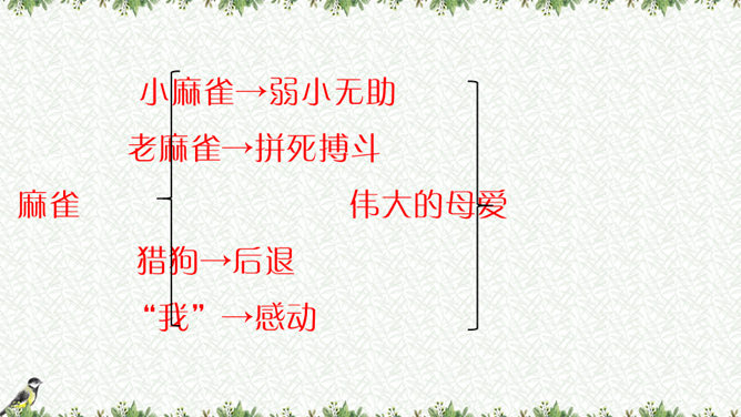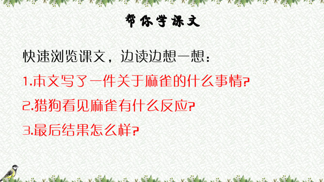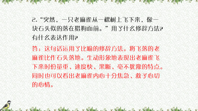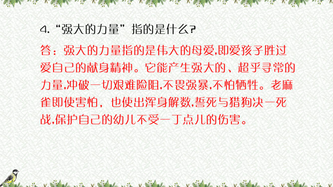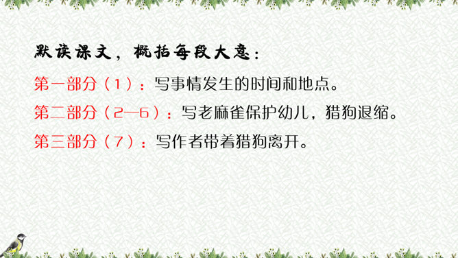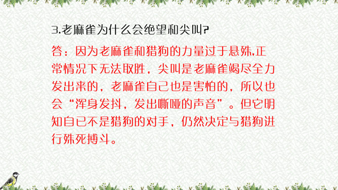 朗读课文。说说课文围绕麻雀写了一件什么事, 这件事的起因、经过和结果是怎样的。参考答案:猎狗发现弱小的小麻雀在地上打算攻击它,老麻雀从树上飞下拼死准备和猎狗搏斗,最后麻雀以自己的勇气使得猎狗退缩,救下自己幼儿。起因:大风把小麻雀吹落地上,猎狗发现它,打算吃掉它。经过:老麻雀从树上飞落地上,全身羽毛挖挲起来,拼尽全力打算和猎狗进行搏斗。结果:猎狗退缩,“我”唤回猎狗。所属专题:麻雀ppt。