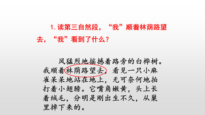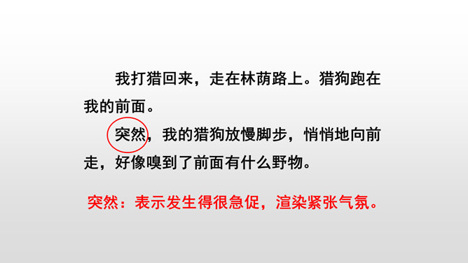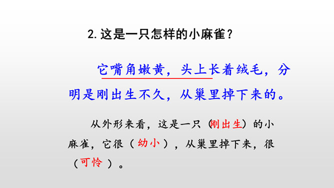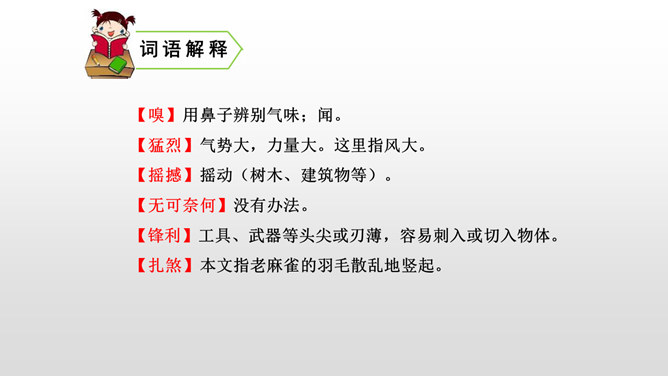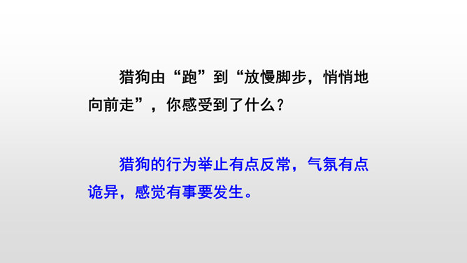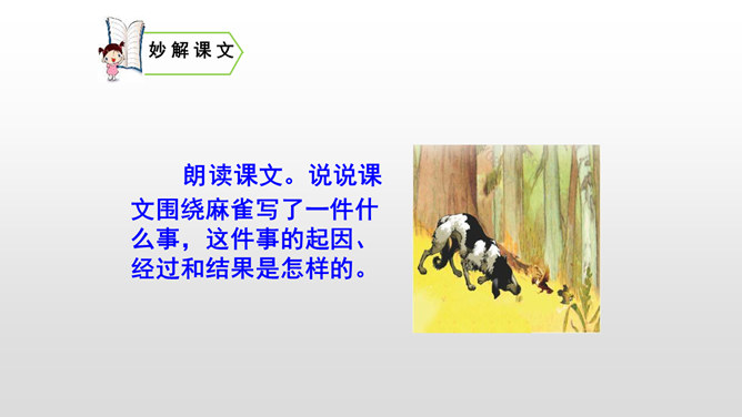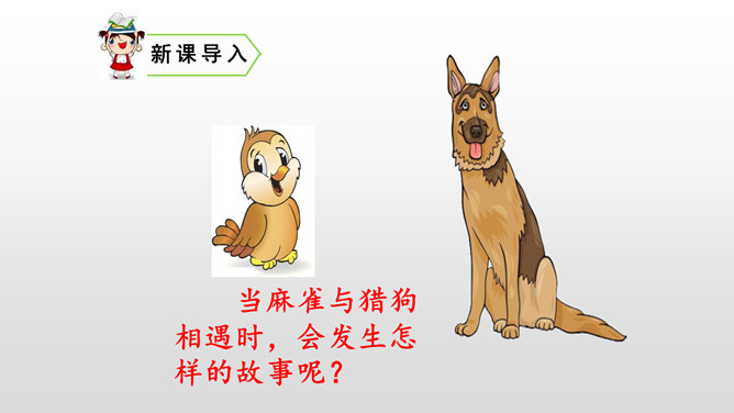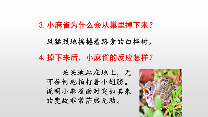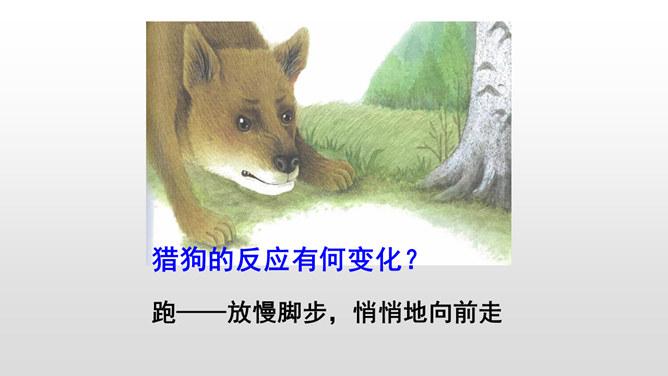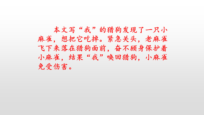 本文写“我”的猎狗发现了一只小麻雀,想把它吃掉。紧急关头,老麻雀飞下来落在猎狗面前,奋不顾身保护着小麻雀,结果“我”唤回猎狗,小麻雀免受伤害。你觉得这是一只怎样的老麻雀?勇敢无私,为救自己的孩子奋不顾身,母爱很伟大。文中的猎狗先进后退,具体是怎么写的?猎狗为什么会有这样的转变?猎狗之所以有这样的变化,是因为它被老麻雀的勇气震慑住了,这从侧面说明母爱很伟大。所属专题:麻雀ppt。