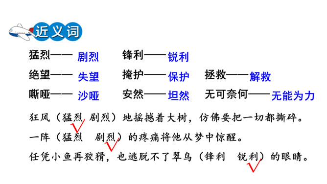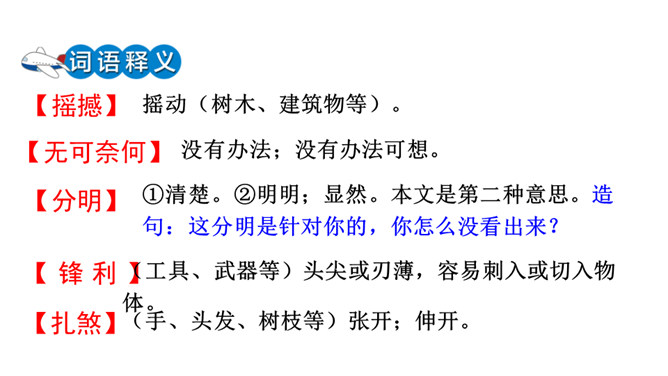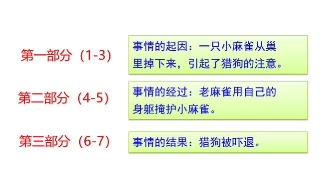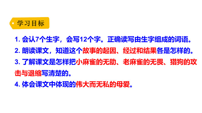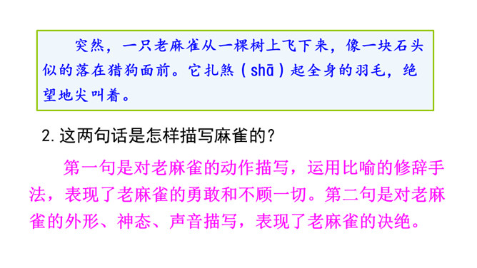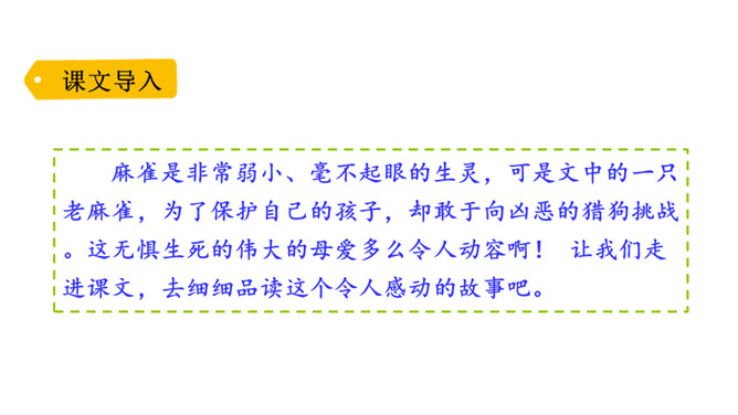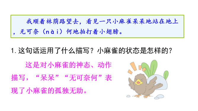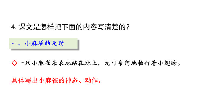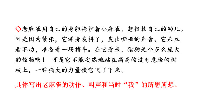 第一句,“无助”是个概括性的词语,究竟怎么“无助”我们不知道。第二句,“呆呆地站在地上,无可奈何地拍打着小翅膀”具体地写出了小麻雀“无助”的样子。与第一个句子相比,这个句子就写得很具体。你发现了吗?如果我们把概括性的词语换成具体形象的描绘,句子就写具体了。举个例子,我们把“夏天真热”这句概括性的话,用形象的描绘来写具体:太阳怎样?地面怎样?狗、鸡、蝉怎样? 树叶怎样?人怎样?把这些相关联的现象都写出来,就有了生动而形象的描绘。所属专题:麻雀ppt。