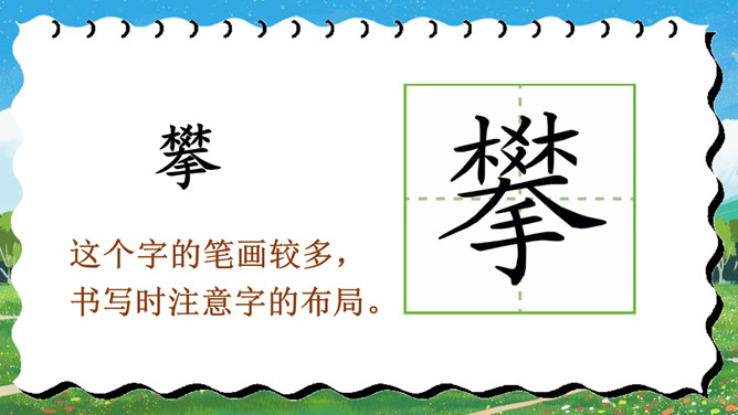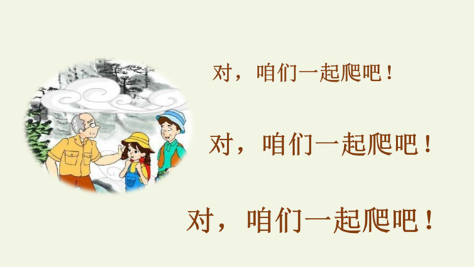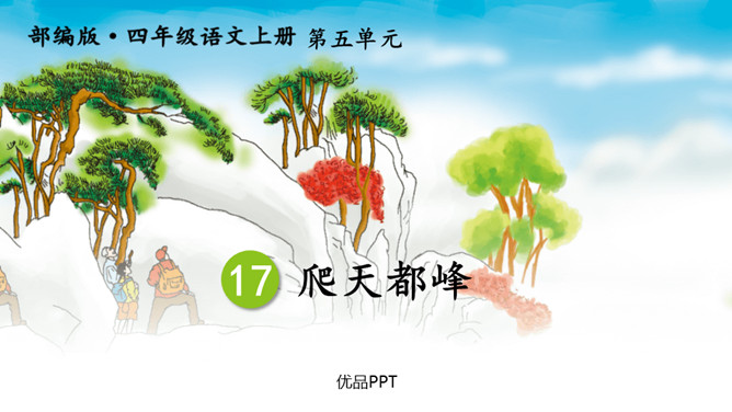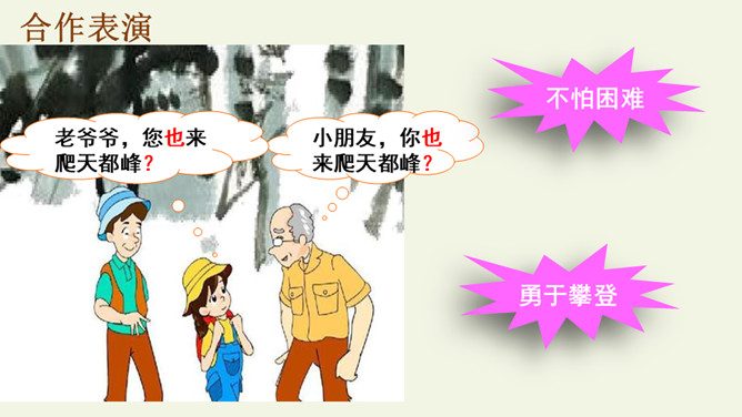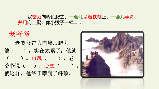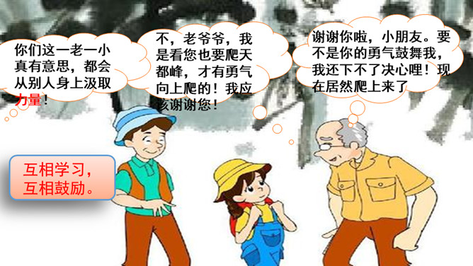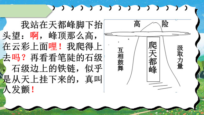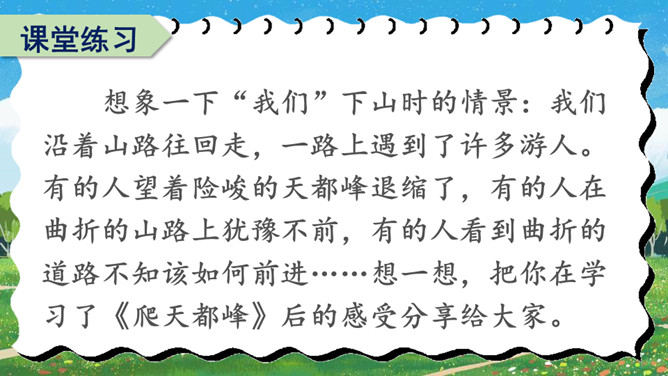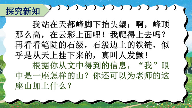 根据你从文中得到的信息,“我”眼中是一座怎样的山?你还可以为老师的这座山加上什么? 想象一下“我们”下山时的情景:我们沿着山路往回走,一路上遇到了许多游人。有的人望着险峻的天都峰退缩了,有的人在曲折的山路上犹豫不前,有的人看到曲折的道路不知该如何前进……想一想,把你在学习后的感受分享给大家。这个字的笔画较多,书写时注意字的布局。所属专题:爬天都峰ppt。