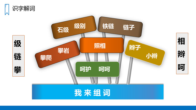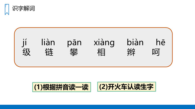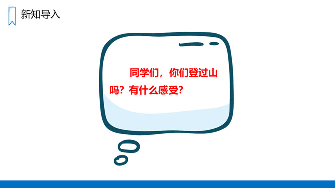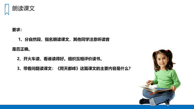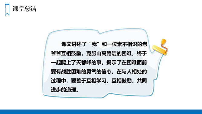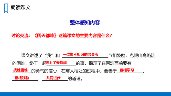 同学们,你们登过山吗?有什么感受?要求:1、不认识的字可以看拼音,或者请教别人。2、读准每一个字的字音,圈出生字词;3、读通每个句子,读不通顺的多读几遍;4、给每个自然段写上序号。课文讲述了“我”和一位素不相识的老爷爷互相鼓励,克服山高路陡的困难,终于一起爬上了天都峰的事,揭示了在困难面前要有战胜困难的勇气的信心,在与人相处的过程中,要善于互相学习,互相鼓励、共同进步的道理。所属专题:爬天都峰ppt。