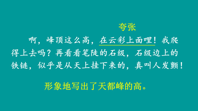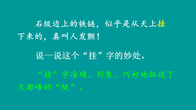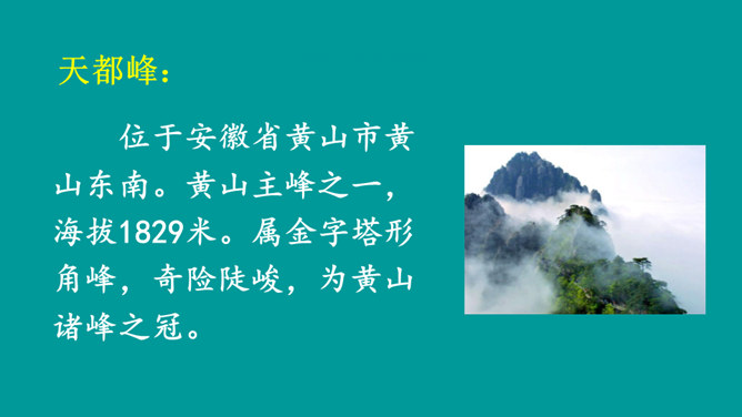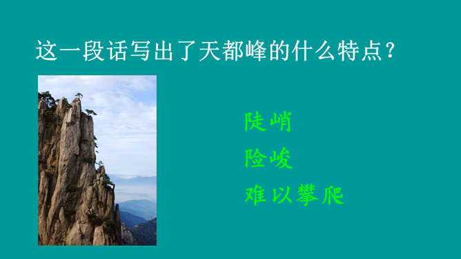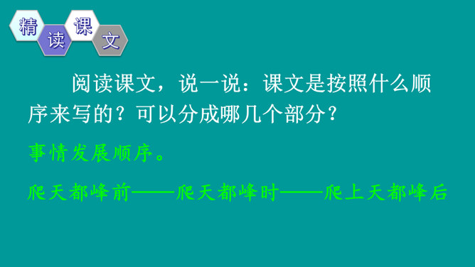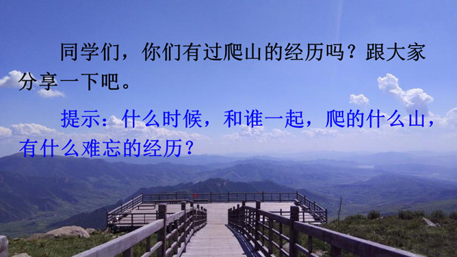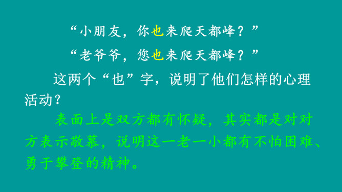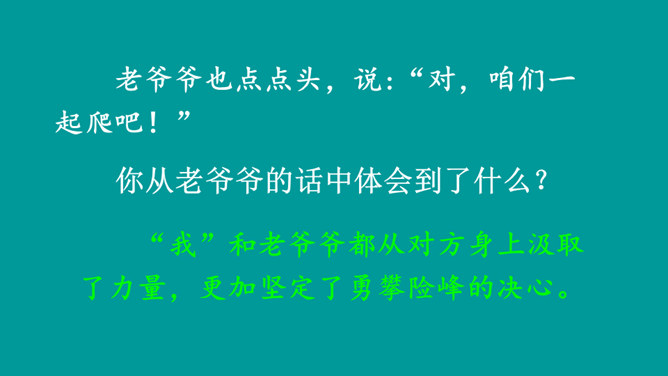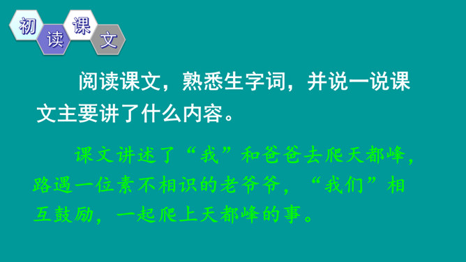 同学们,你们有过爬山的经历吗?跟大家分享一下吧。提示:什么时候,和谁一起,爬的什么山,有什么难忘的经历?阅读课文,熟悉生字词,并说一说课文主要讲了什么内容。课文讲述了“我”和爸爸去爬天都峰,路遇一位素不相识的老爷爷,“我们”相互鼓励,一起爬上天都峰的事。表面上是双方都有怀疑,其实都是对对方表示敬慕,说明这一老一小都有不怕困难、勇于攀登的精神。所属专题:爬天都峰ppt。