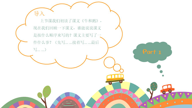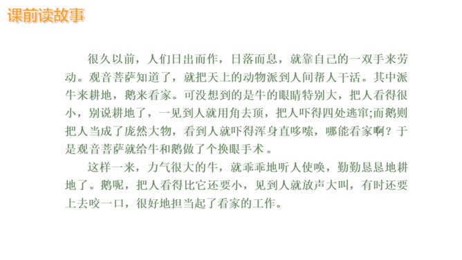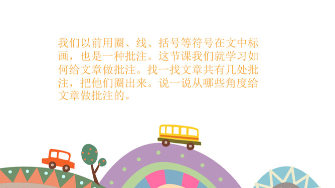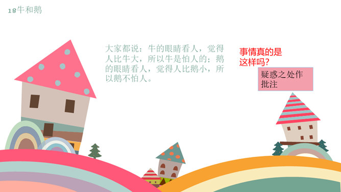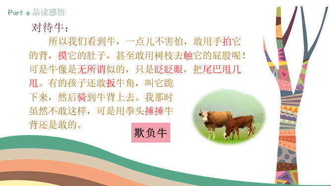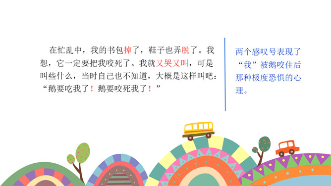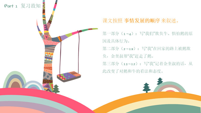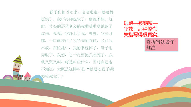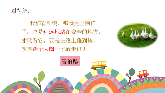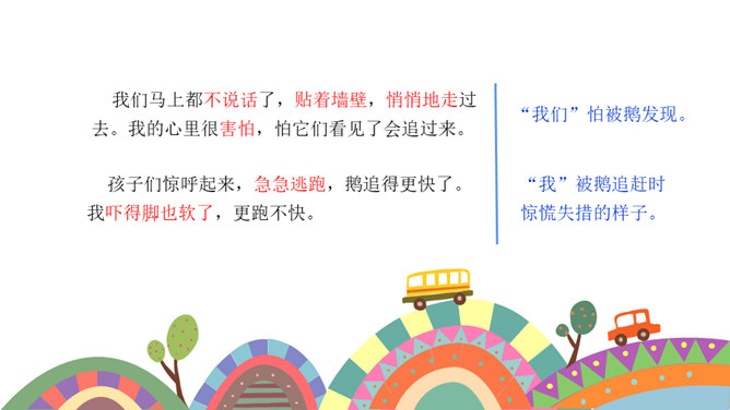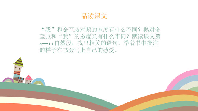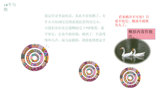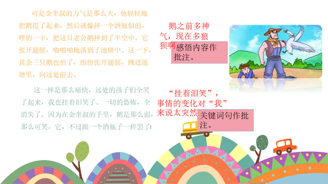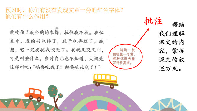 课文按照 事情发展的顺序来叙述。 第一部分(1~4):写“我们”欺负牛、惧怕鹅的原因及具体行为。第二部分(5~12):写“我”在回家的路上被鹅欺负,金奎叔帮“我”赶走了鹅。第三部分(13~15):写“我”记着金奎叔的话,从此改变了对鹅和牛的看法和态度。预习时,你们有没有发现文章一旁的红色字体?他们有什么作用?我们以前用圈、线、括号等符号在文中标画,也是一种批注。这节课我们就学习如何给文章做批注。找一找文章共有几处批注,把他们圈出来。说一说从哪些角度给文章做批注的。所属专题:牛和鹅ppt。