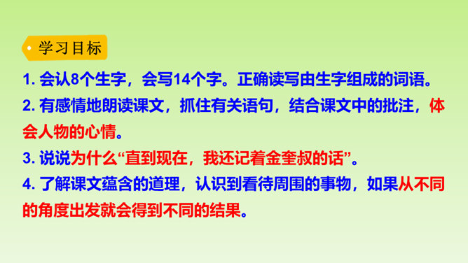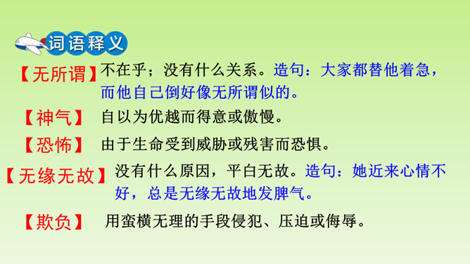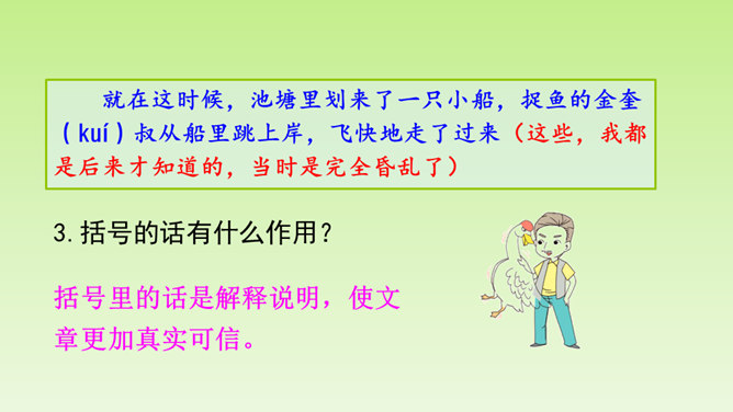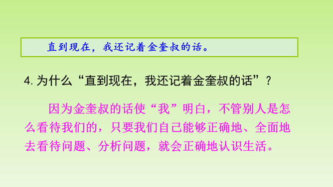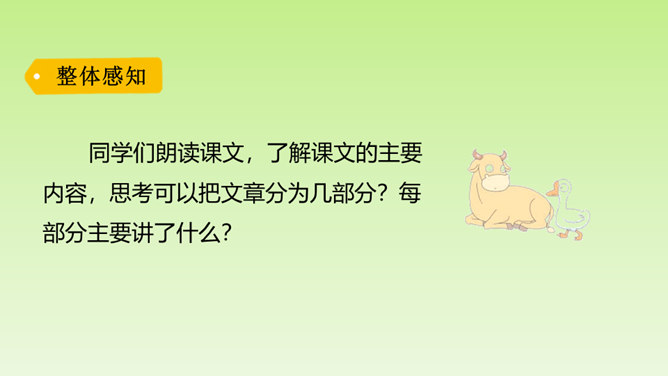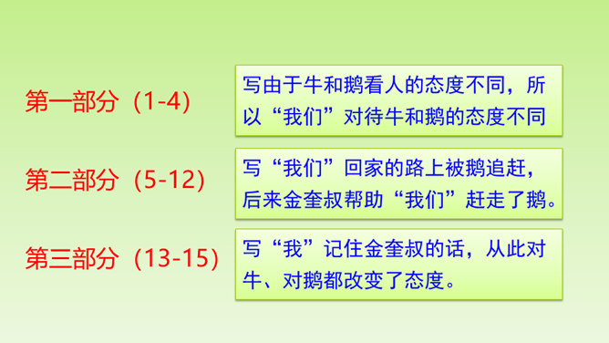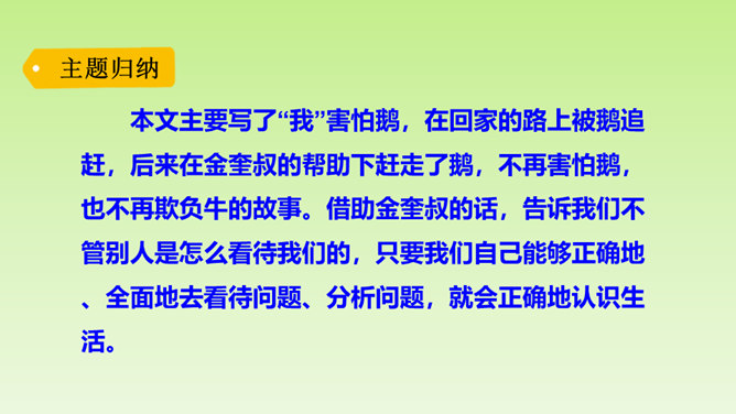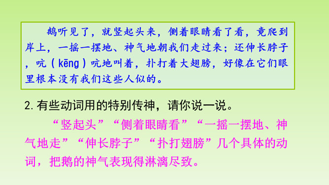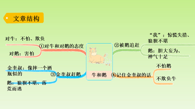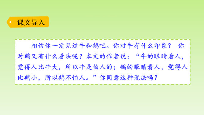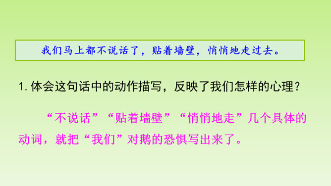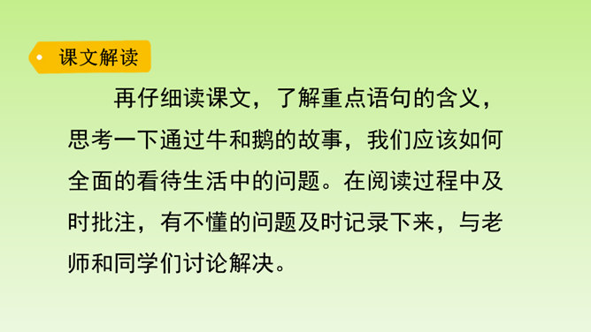 再仔细读课文,了解重点语句的含义,思考一下通过牛和鹅的故事,我们应该如何全面的看待生活中的问题。在阅读过程中及时批注,有不懂的问题及时记录下来,与老师和同学们讨论解决。“不说话”“贴着墙壁”“悄悄地走”几个具体的动词,就把“我们”对鹅的恐惧写出来了。“竖起头”“侧着眼睛看”“一摇一摆地、神气地走”“伸长脖子”“扑打翅膀”几个具体的动词,把鹅的神气表现得淋漓尽致。括号里的话是解释说明,使文章更加真实可信。所属专题:牛和鹅ppt。