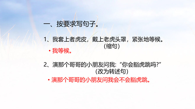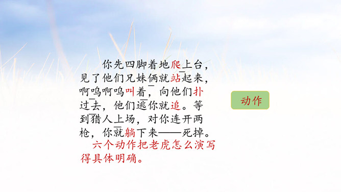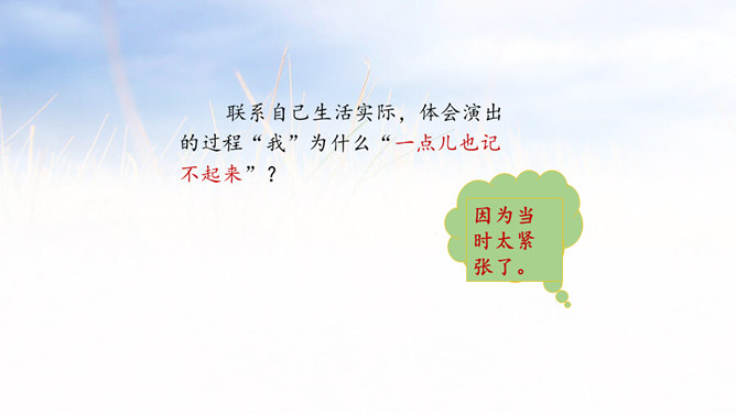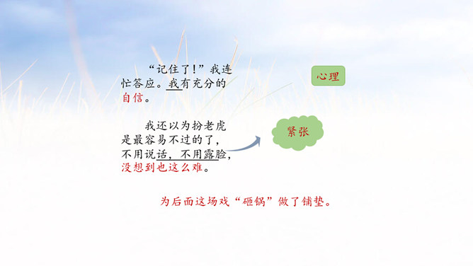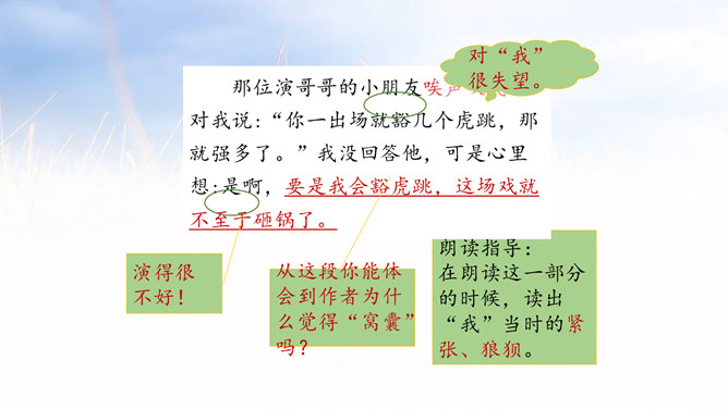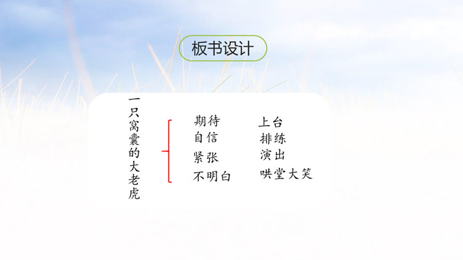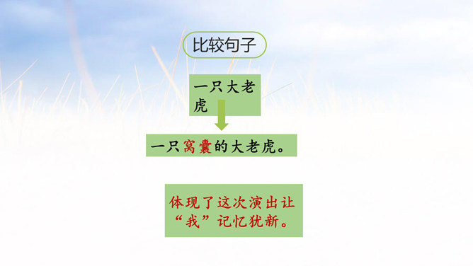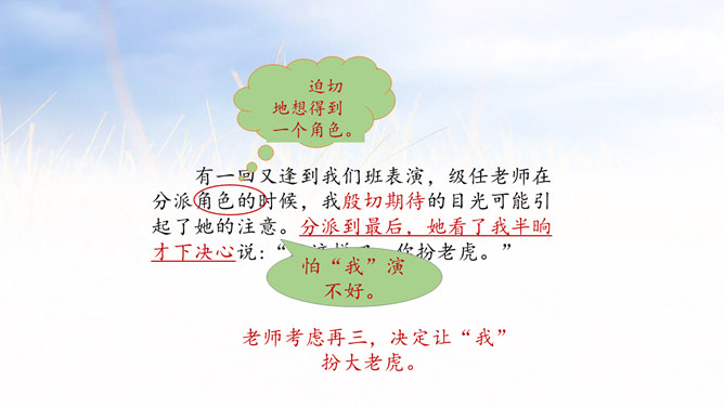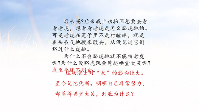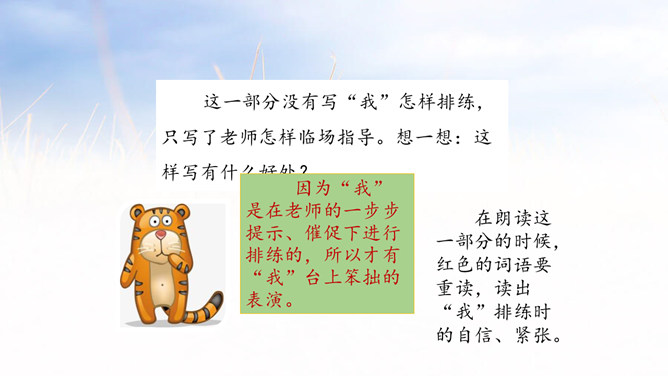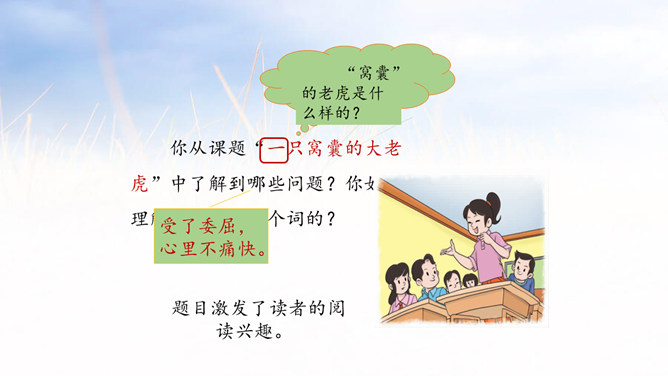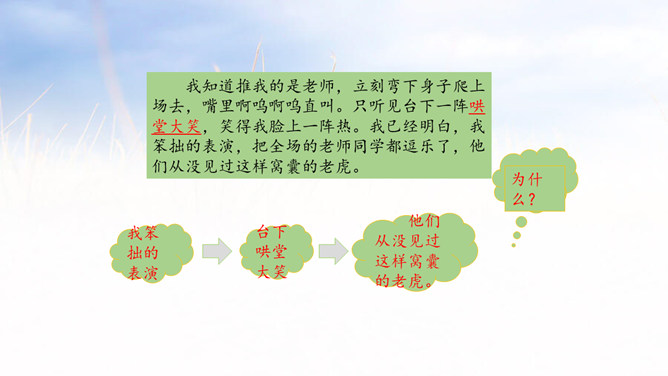 上节课我们学习了生字,这节课让我们和作者一起走进这个有趣的故事。因为“我”是在老师的一步步提示、催促下进行排练的,所以才有“我”台上笨拙的表演。朗读指导:在朗读这一部分的时候,读出“我”当时的紧张、狼狈。从这段你能体会到作者为什么觉得“窝囊”吗? 这场演出对“我”的影响很大。至今记忆犹新。明明自己非常努力,却惹得哄堂大笑,到底为什么?作者一直觉得自己演砸了锅所以不开心,你觉得“我”真是一只窝囊的大老虎吗?应该怎么开导“我”?所属专题:一只窝囊的大老虎ppt。