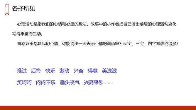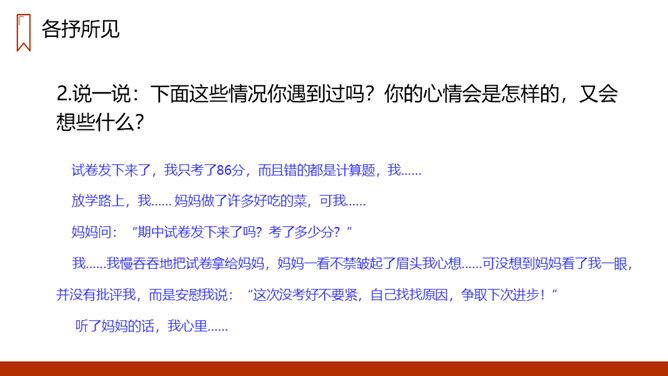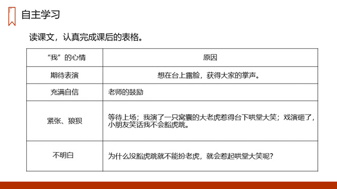 生活中我们也会经历许许多多有趣的事情,不论是高兴的,还是难过的,不论是好事,还是傻事,无论是成功还是失败,都是我们最美好的回忆。平时同学们要多留心生活,把生活中发生的点点滴滴及时记下来。1.阅读一些与老虎有关的故事或搜集一些带“虎”字的成语。2.有兴趣的同学可以画一幅老虎图,看谁画的最好,在教室里张贴出来。说一说:下面这些情况你遇到过吗?你的心情会是怎样的,又会想些什么?所属专题:一只窝囊的大老虎ppt。