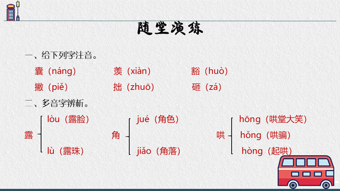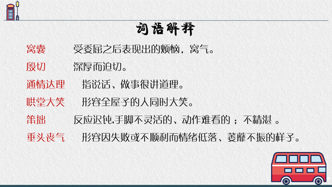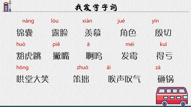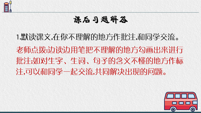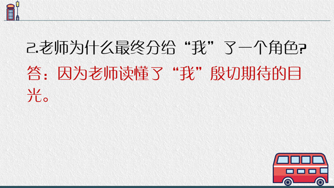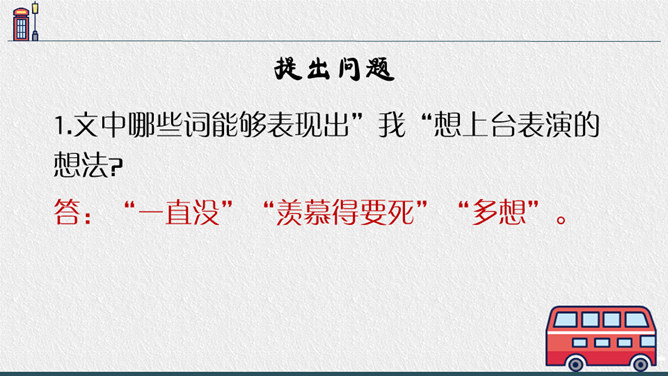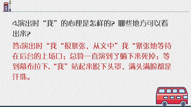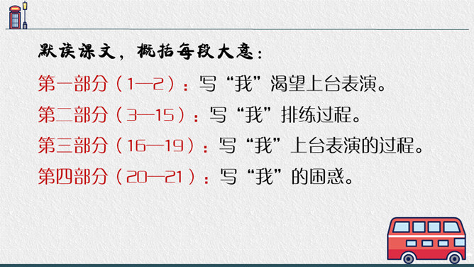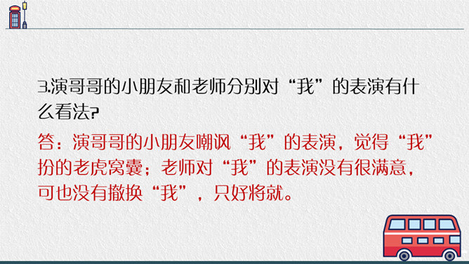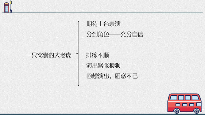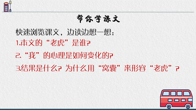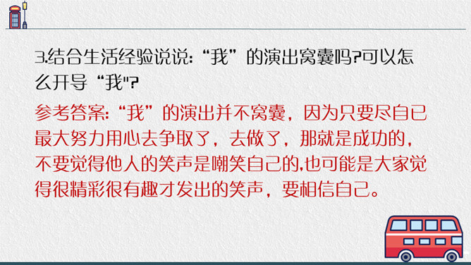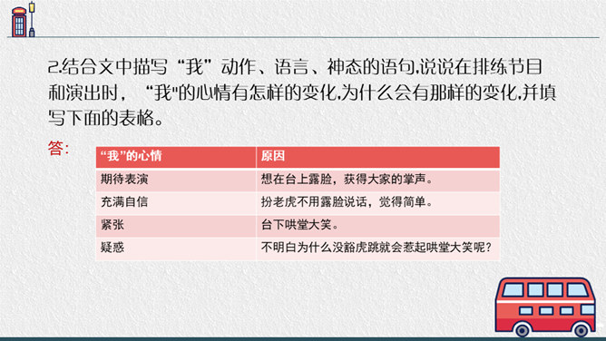 老师点拨:边读边用笔把不理解的地方勾画出来进行批注;如对生字、生词、句子的含义不懂的地方作标注,可以和同学一起交流,共同解决出现的问题。2.结合文中描写“我”动作、语言、神态的语句,说说在排练节目和演出时,“我"的心情有怎样的变化,为什么会有那样的变化,并填写下面的表格。3.结合生活经验说说:“我”的演出窝囊吗?可以怎么开导“我"?参考答案:“我”的演出并不窝囊,因为只要尽自已最大努力用心去争取了,去做了,那就是成功的,不要觉得他人的笑声是嘲笑自己的,也可能是大家觉得很精彩很有趣才发出的笑声,要相信自己。所属专题:一只窝囊的大老虎ppt。