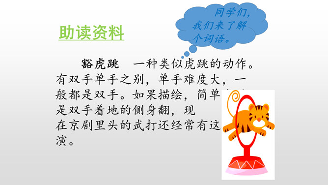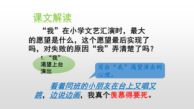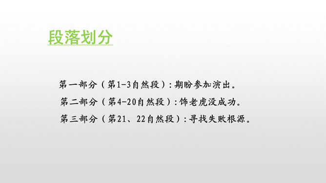 1.课文讲了一件什么事?“我”扮演一只大老虎结果演砸锅了。2.为什么“我”的演出引来观众的哄堂大笑呢?因为过于紧张,不会豁虎跳,只会趴在台上啊呜啊呜叫。第一部分(第1-3自然段):期盼参加演出。第二部分(第4-20自然段):饰老虎没成功。第三部分(第21、22自然段):寻找失败根源。“我”在小学文艺汇演时,最大的愿望是什么,这个愿望最后实现了吗,对失败的原因“我”弄清楚了吗?所属专题:一只窝囊的大老虎ppt。