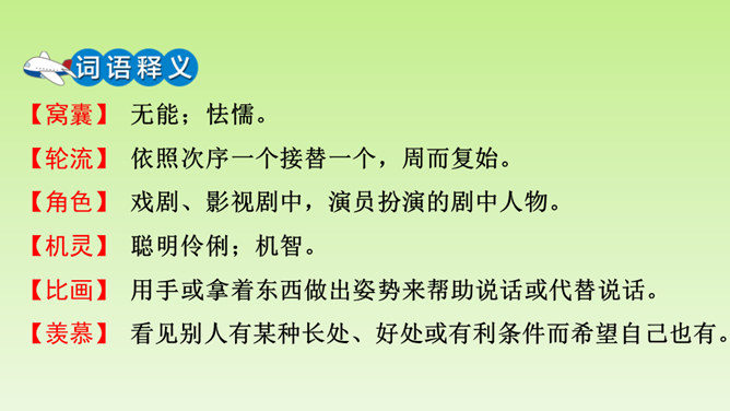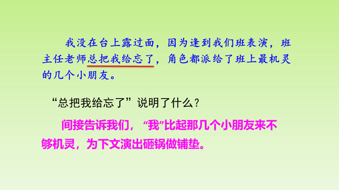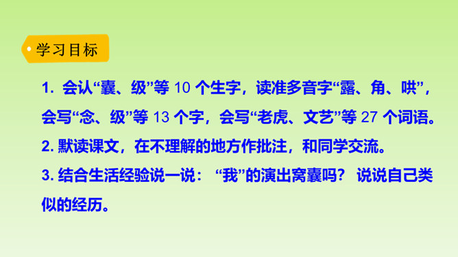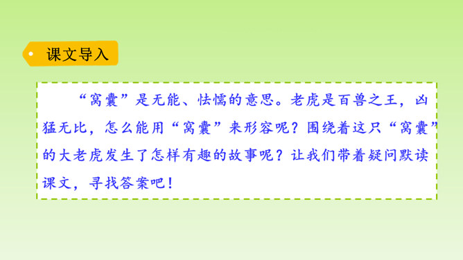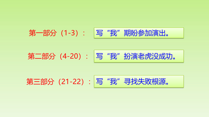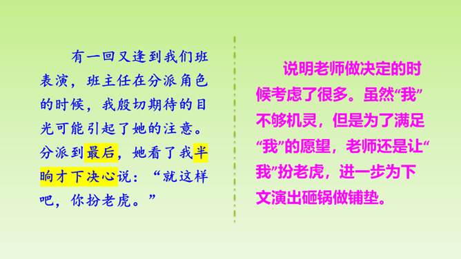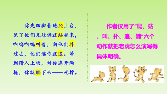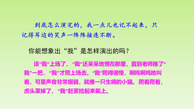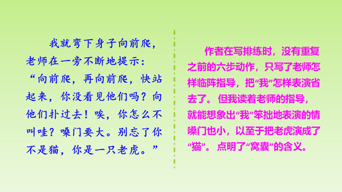 “总把我给忘了”说明了什么?间接告诉我们, “我”比起那几个小朋友来不够机灵,为下文演出砸锅做铺垫。说明老师做决定的时候考虑了很多。虽然“我”不够机灵,但是为了满足“我”的愿望,老师还是让“我”扮老虎,进一步为下文演出砸锅做铺垫。作者仅用了“爬、站、叫、扑、追、躺”六个动作就把老虎怎么演写得具体明确。作者在写排练时,没有重复之前的六步动作,只写了老师怎样临阵指导,把“我”怎样表演省去了。 但我读着老师的指导,就能想象出“我”笨拙地表演的情嗓门也小,以至于把老虎演成了“猫”。 点明了“窝囊”的含义。所属专题:一只窝囊的大老虎ppt。