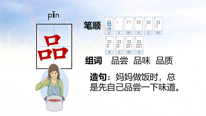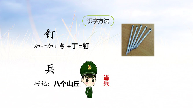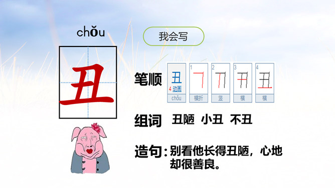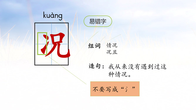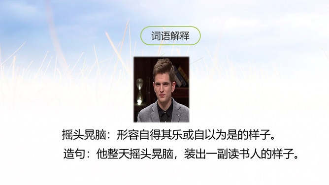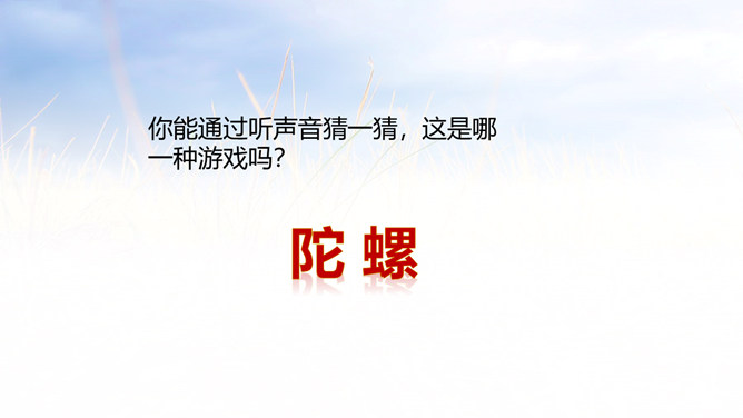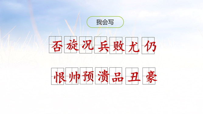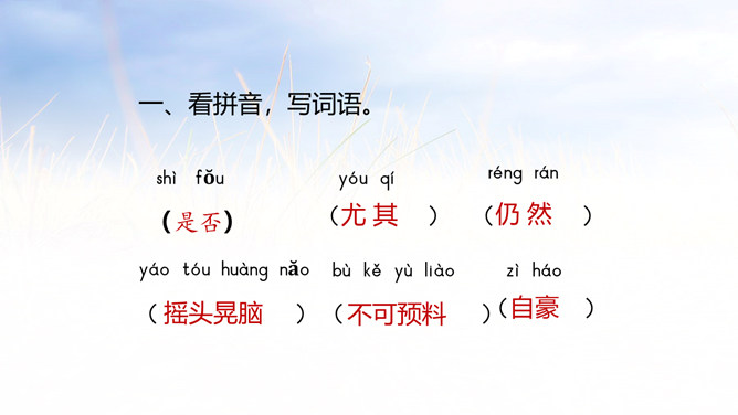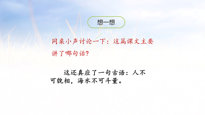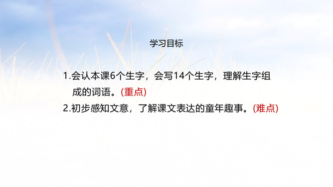 1.会认本课6个生字,会写14个生字,理解生字组成的词语。(重点)2.初步感知文意,了解课文表达的童年趣事。(难点)你能通过听声音猜一猜,这是哪一种游戏吗?同桌小声讨论一下:这篇课文主要讲了哪句话?这还真应了一句古语:人不可貌相,海水不可斗量。摇头晃脑:形容自得其乐或自以为是的样子。造句:他整天摇头晃脑,装出一副读书人的样子。预料:指事前作出推测。造句:这件事是否成功并非我能预料。