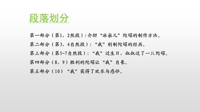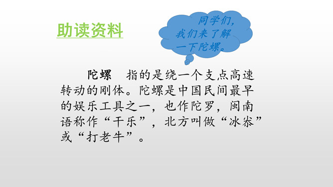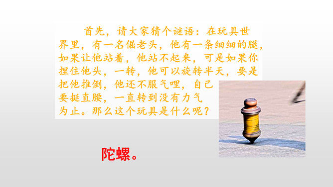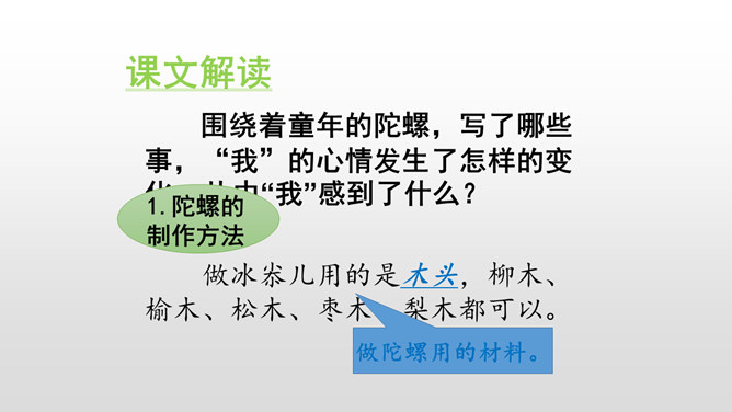 文章中心事件是什么?为什么前面却花大量篇幅写与陀螺相关的其它事呢?因为前面的叙述,更能体现出“我”对陀螺的渴望,当收到叔叔送的陀螺时,沮丧的心情,又与后文获得意外胜利形成鲜明的对比,突出了主题。学过课文,你觉得作者通过写陀螺,反映出怎样的童年生活?反映出一种充满了雀的童年生活。无论是玩陀螺,还是削陀螺,赛陀螺,都是充满童真童趣的。把课文中有关心理描写的句子抄下来。