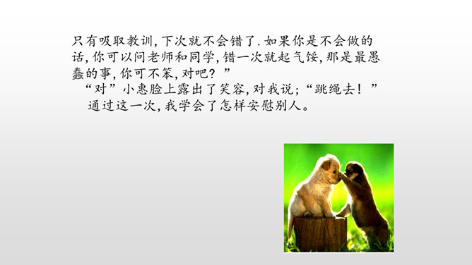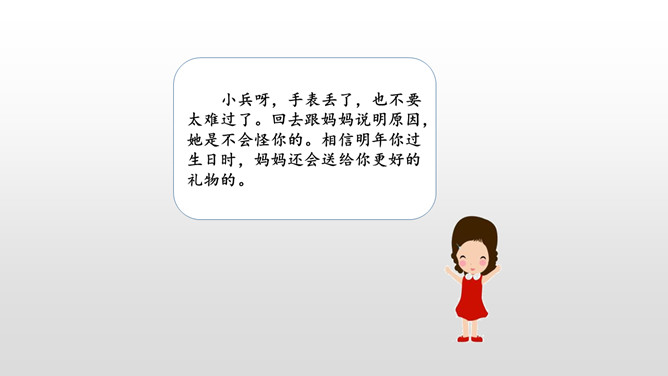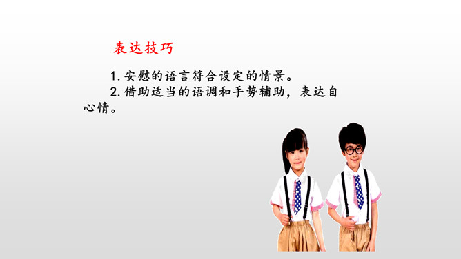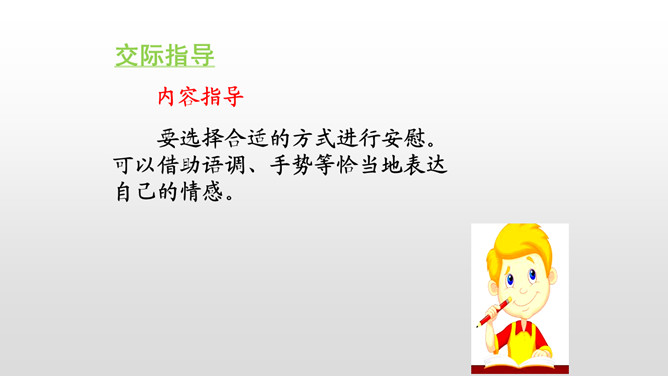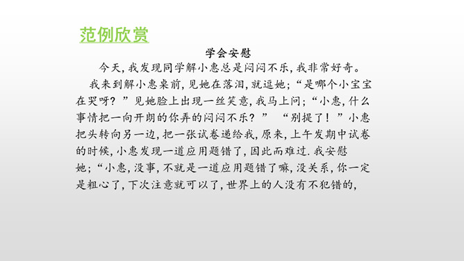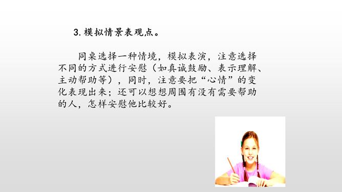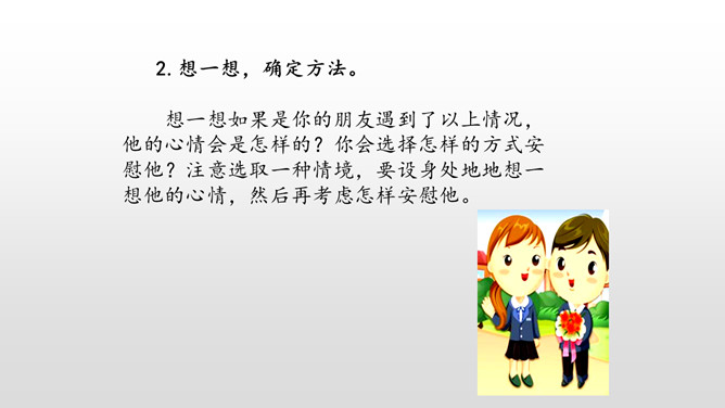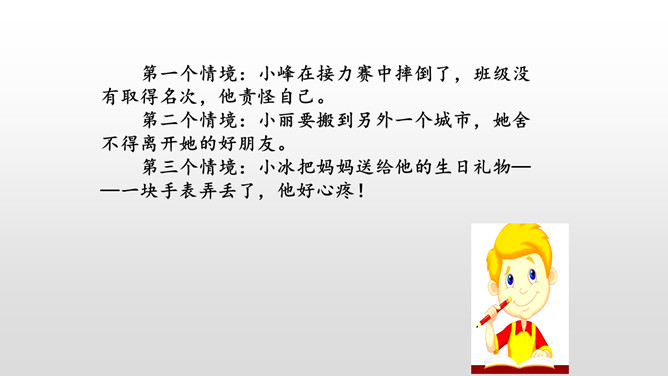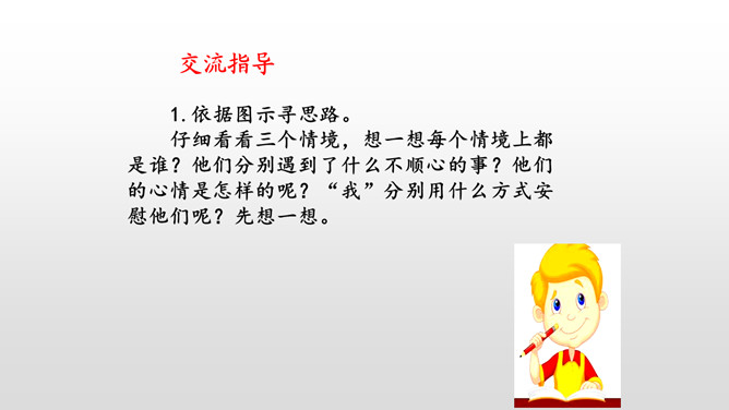 仔细看看三个情境,想一想每个情境上都是谁?他们分别遇到了什么不顺心的事?他们的心情是怎样的呢?“我”分别用什么方式安慰他们呢?先想一想。想一想如果是你的朋友遇到了以上情况,他的心情会是怎样的?你会选择怎样的方式安慰他?注意选取一种情境,要设身处地地想一想他的心情,然后再考虑怎样安慰他。同桌选择一种情境,模拟表演,注意选择不同的方式进行安慰(如真诚鼓励、表示理解、主动帮助等)。所属专题:安慰ppt。