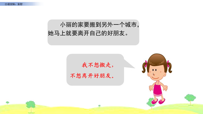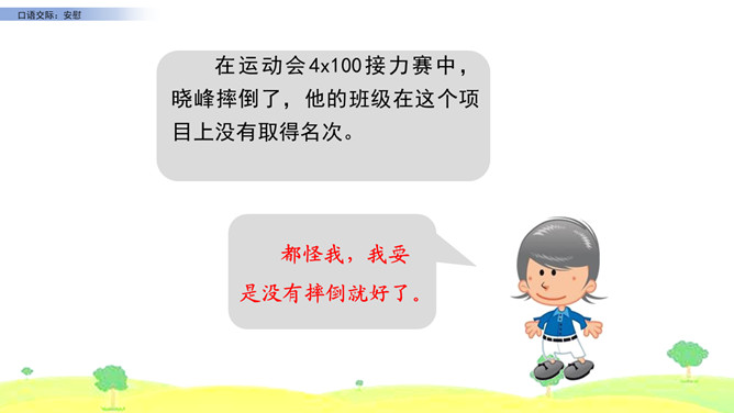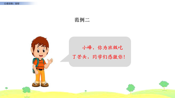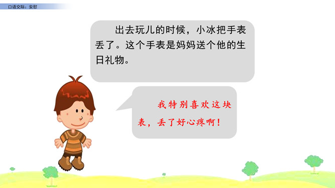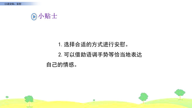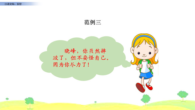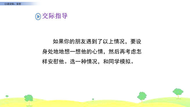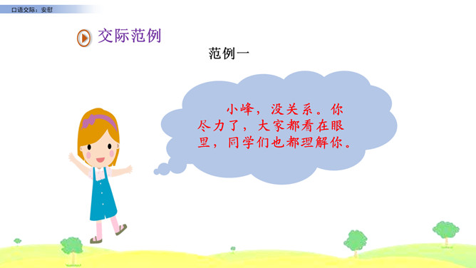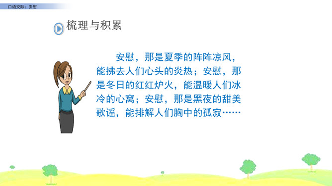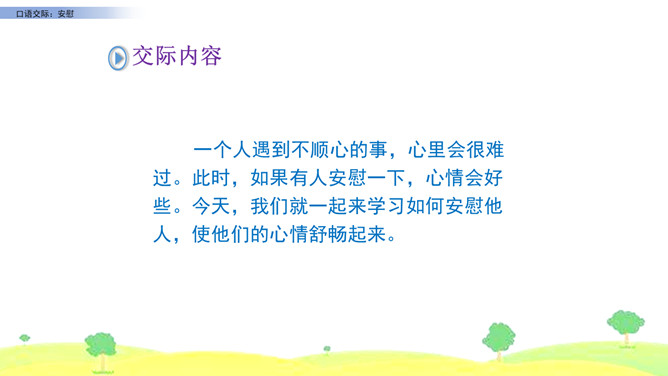 生活中,当我们看到他人难过、焦虑、忧郁、恐慌时,让我们送去一个微笑,一次拥抱,一声理解,一句鼓励,一封简洁的邮件,一块小小的纸巾……只要是真诚的,就一定会把快乐带给他们。与此同时,我们自己也会收获一份浓浓的快乐。 安慰,那是夏季的阵阵凉风,能拂去人们心头的炎热;安慰,那是冬日的红红炉火,能温暖人们冰冷的心窝;安慰,那是黑夜的甜美歌谣,能排解人们胸中的孤寂……所属专题:安慰ppt。